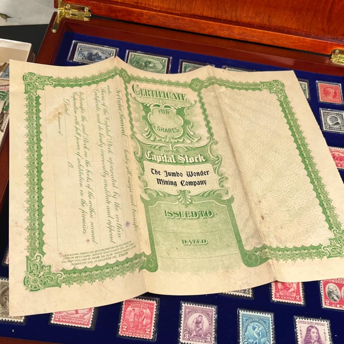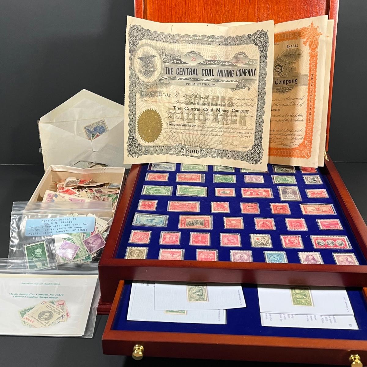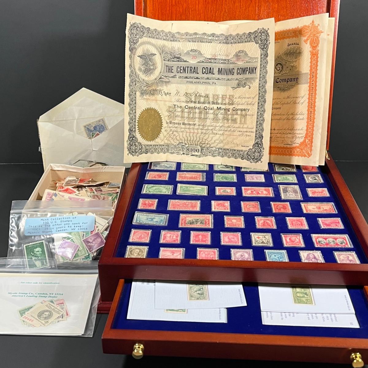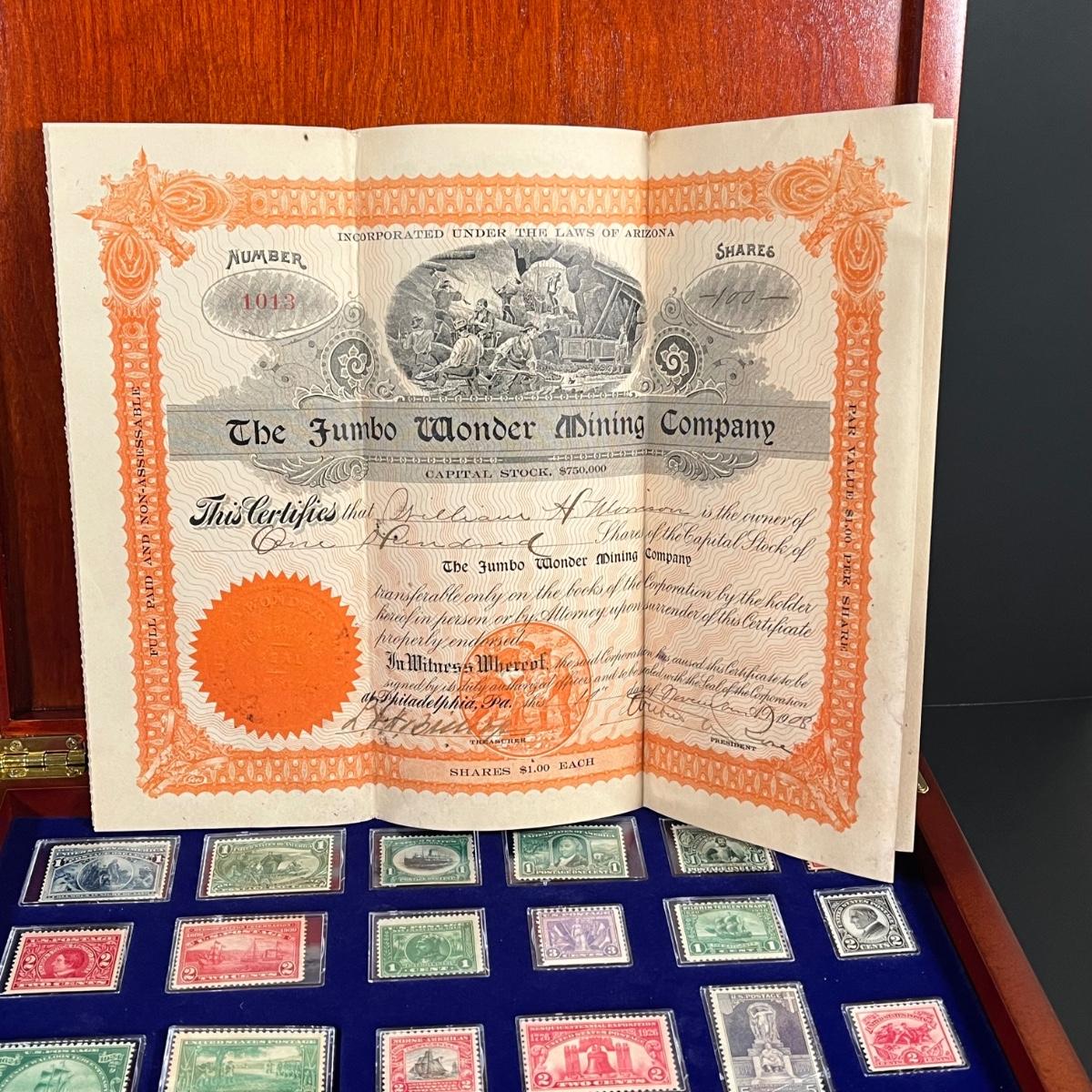 LOT 80D: The First U.S. Commemorative Stamp Issues Set in Case + More Stamps and Antique Stock Certificates