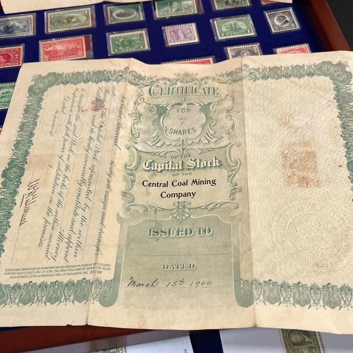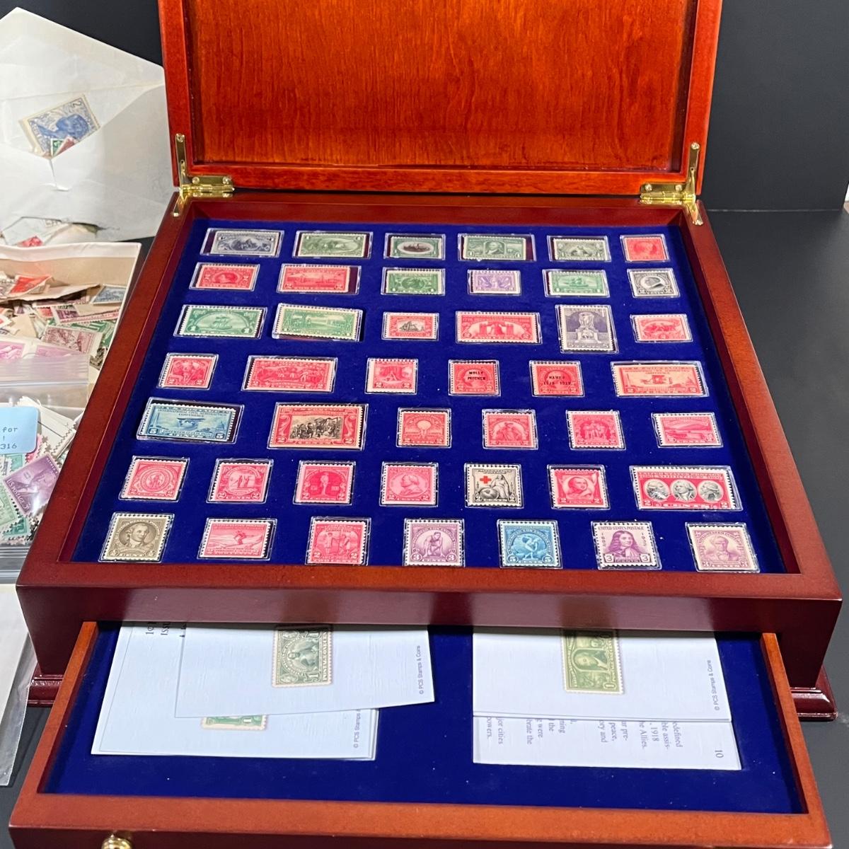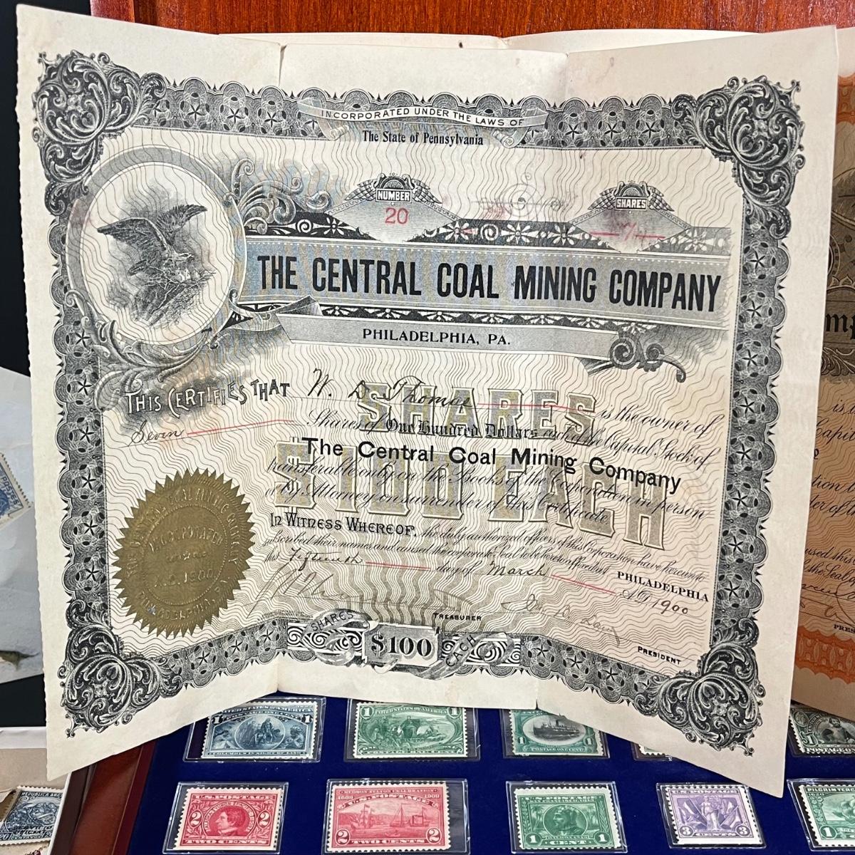 LOT 80D: The First U.S. Commemorative Stamp Issues Set in Case + More Stamps and Antique Stock Certificates
