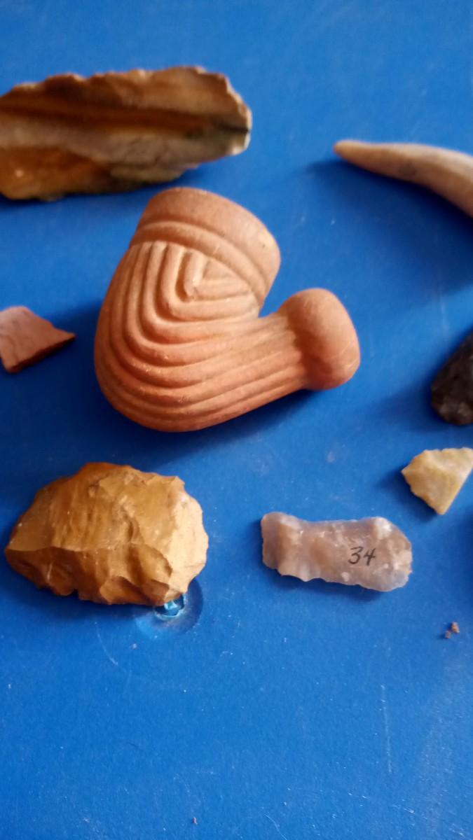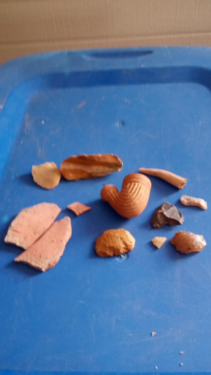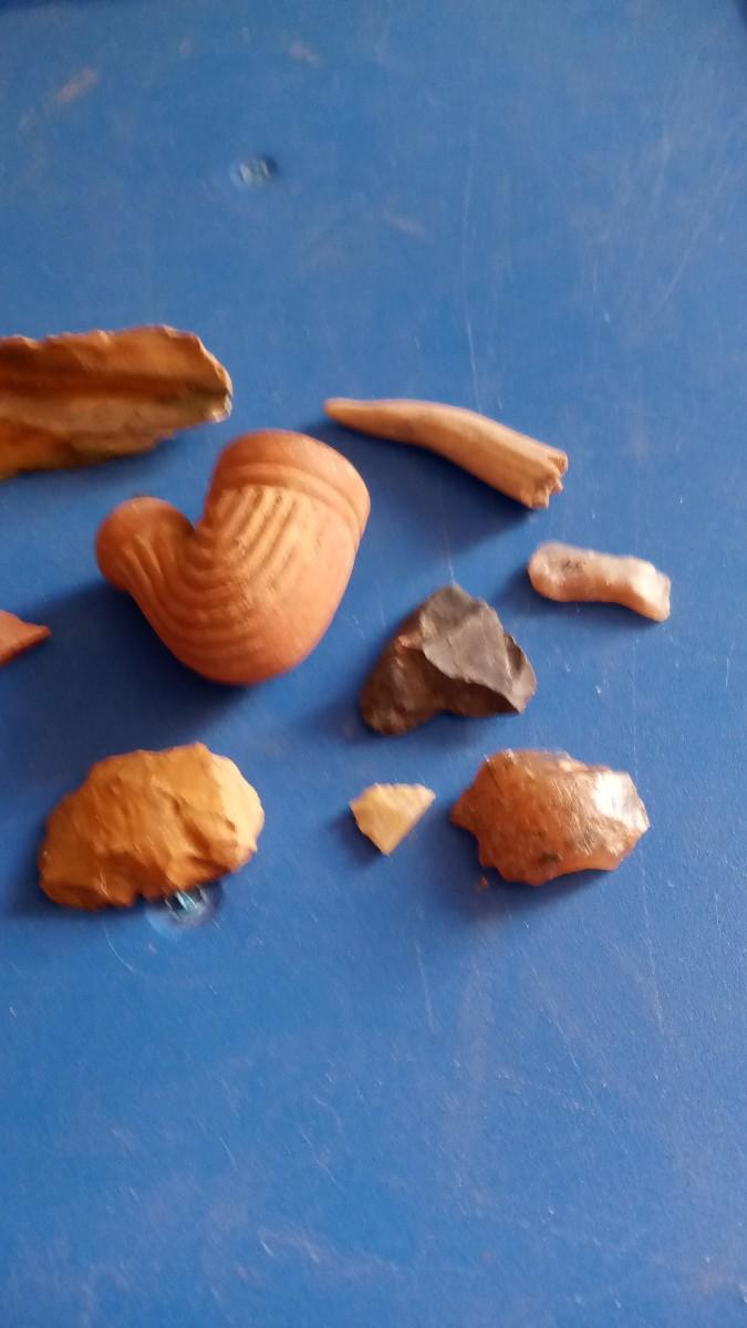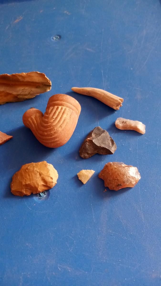 TRADE PIPE PIECES OF POTERY FLINT SCAPERS A COUPLE BROKEN ARROW HEADS
