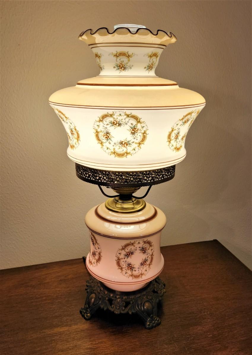 Vintage Colonial style table lamp, 2-way bulbs, metal base. 20.5" tall. Top and bottom light up.