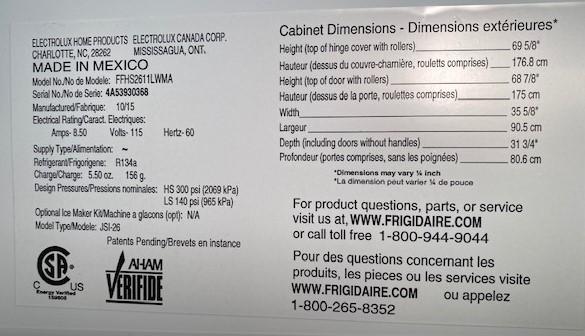 LOT#81K: Frigidaire Bifold Refrigerator/Freezer