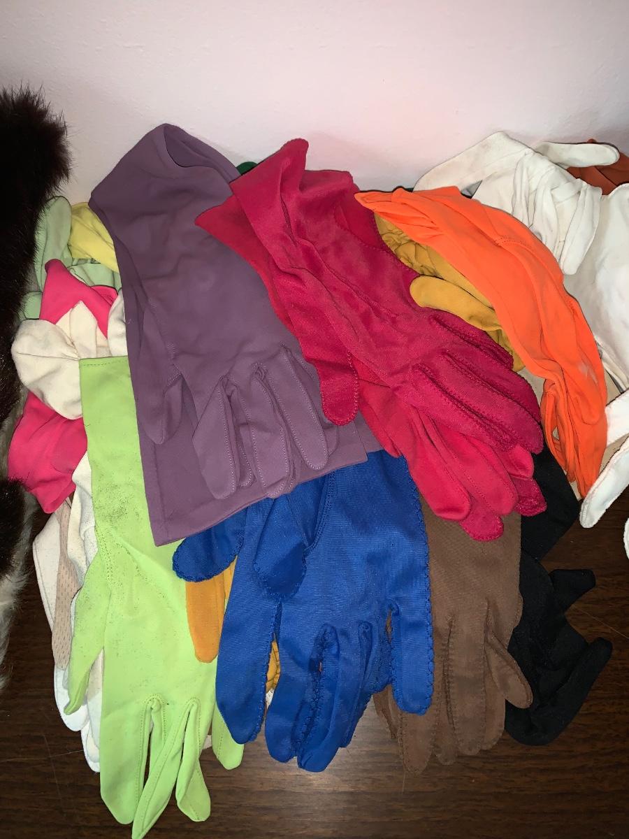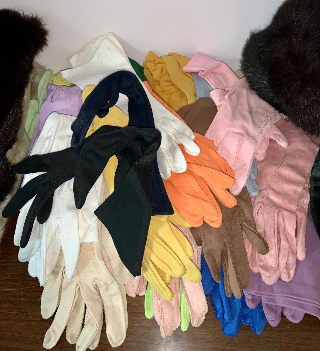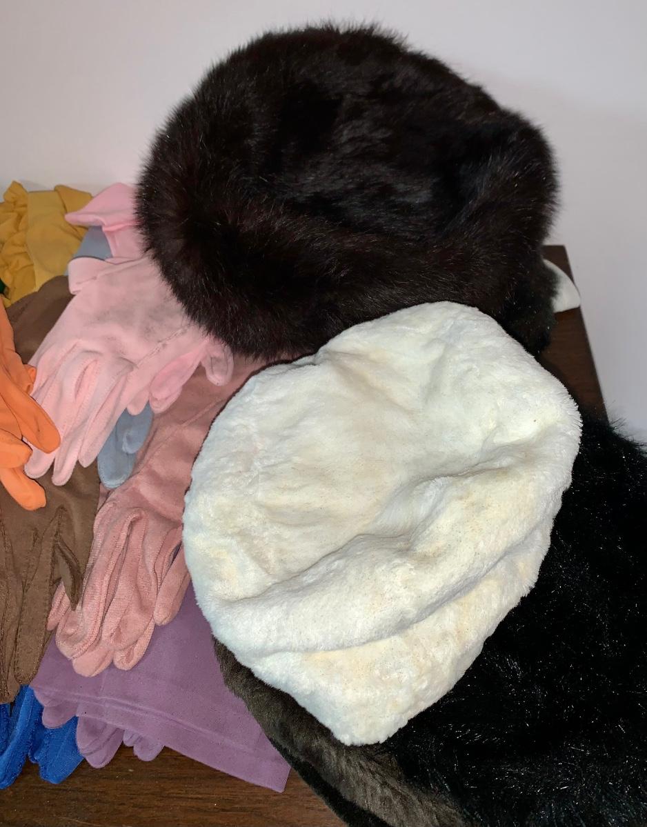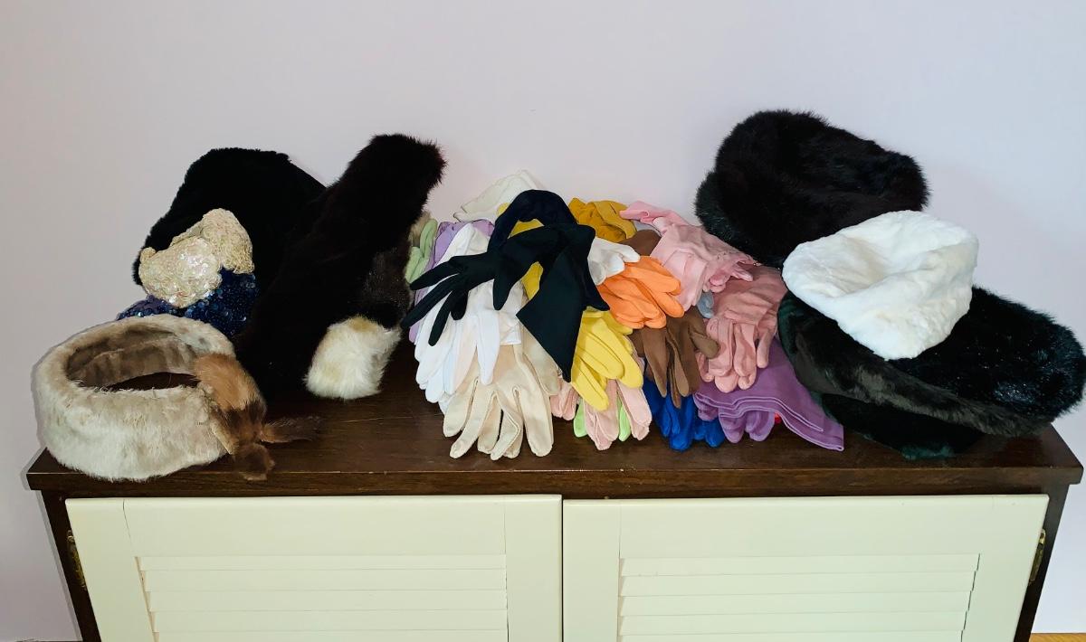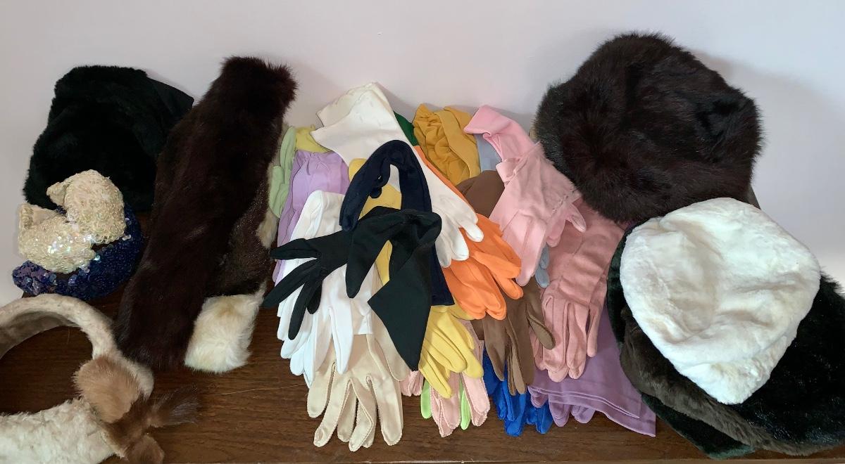 Vintage fashion collections of fur hats and collars along with vintage gloves in every color. Great for a reseller or collector.