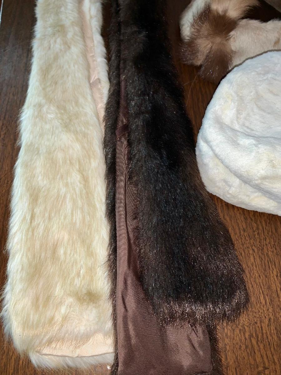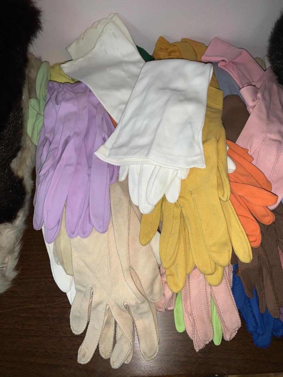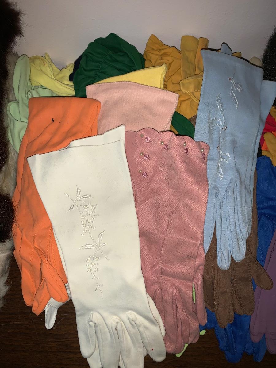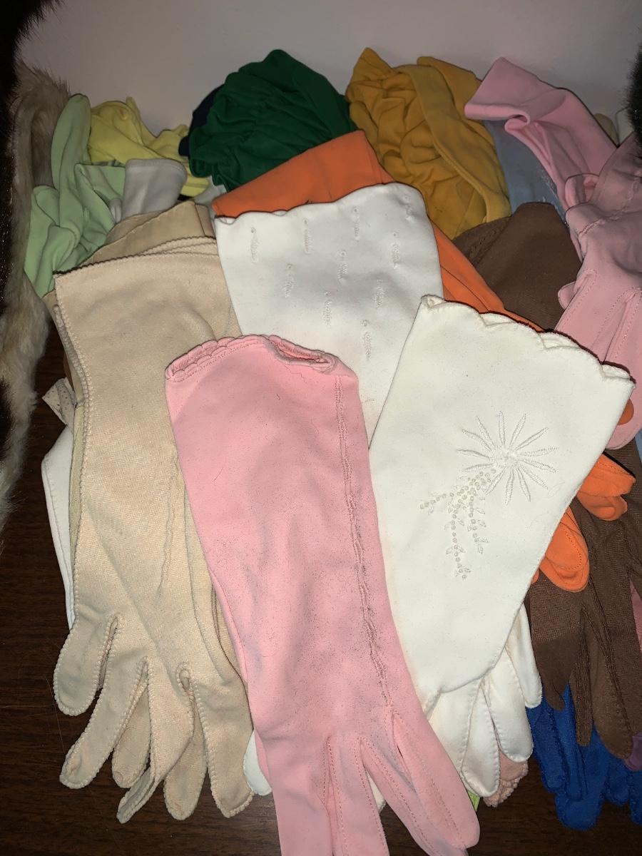 Vintage fashion collections of fur hats and collars along with vintage gloves in every color. Great for a reseller or collector.