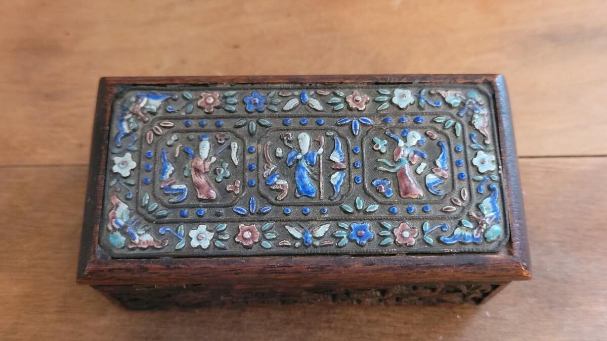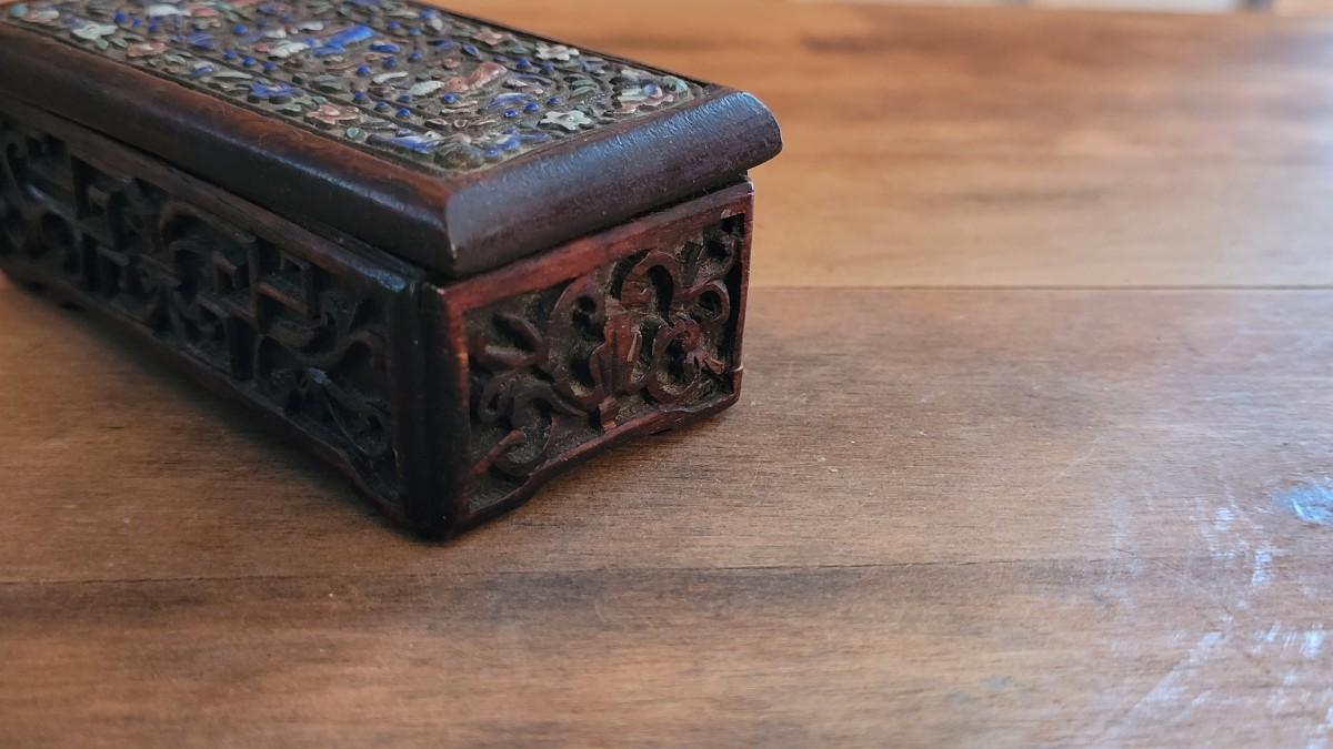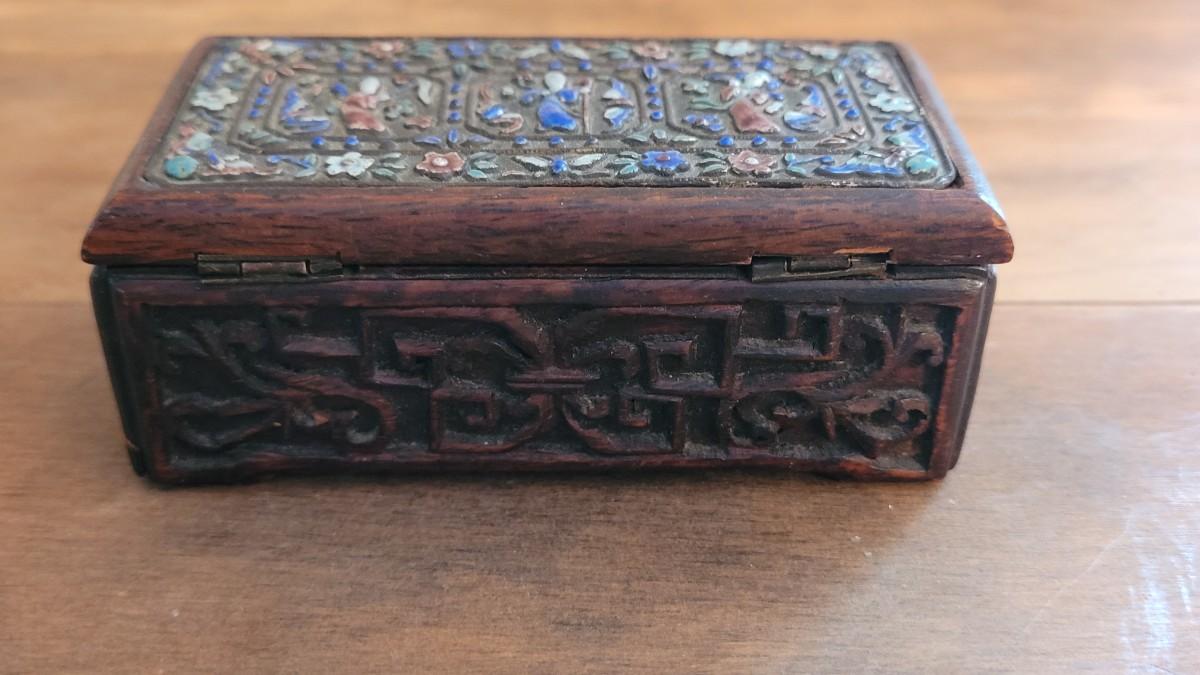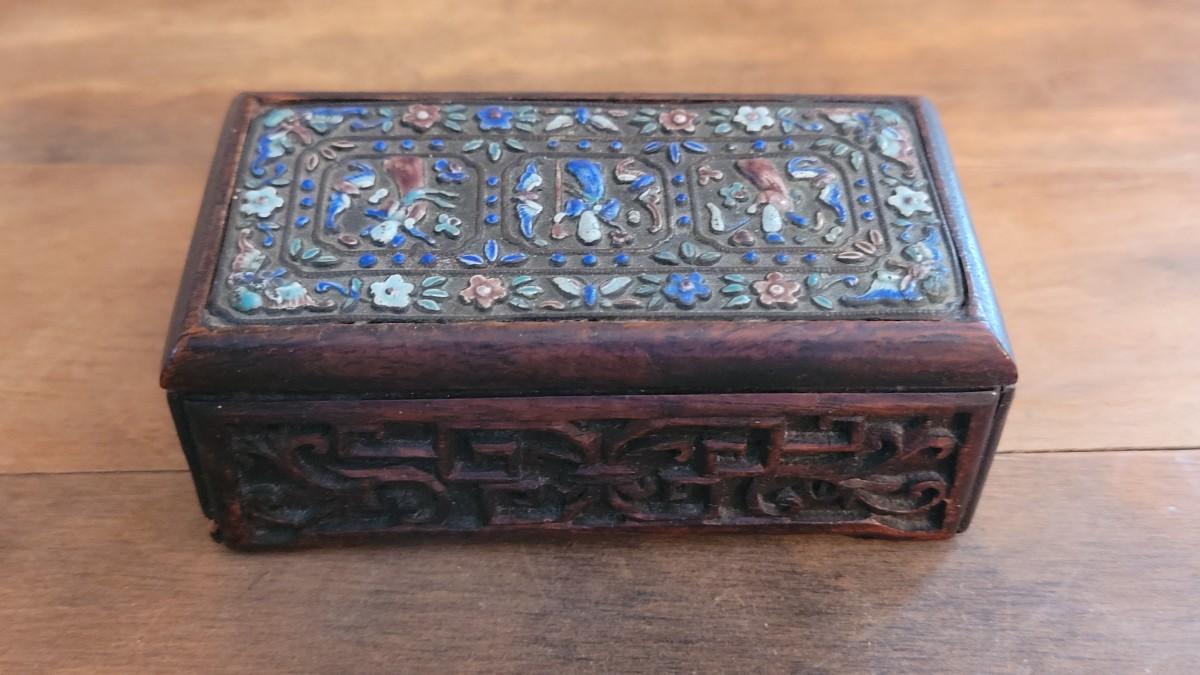 Lot 81: Antique Chinese Carved Wood & Enamel Box