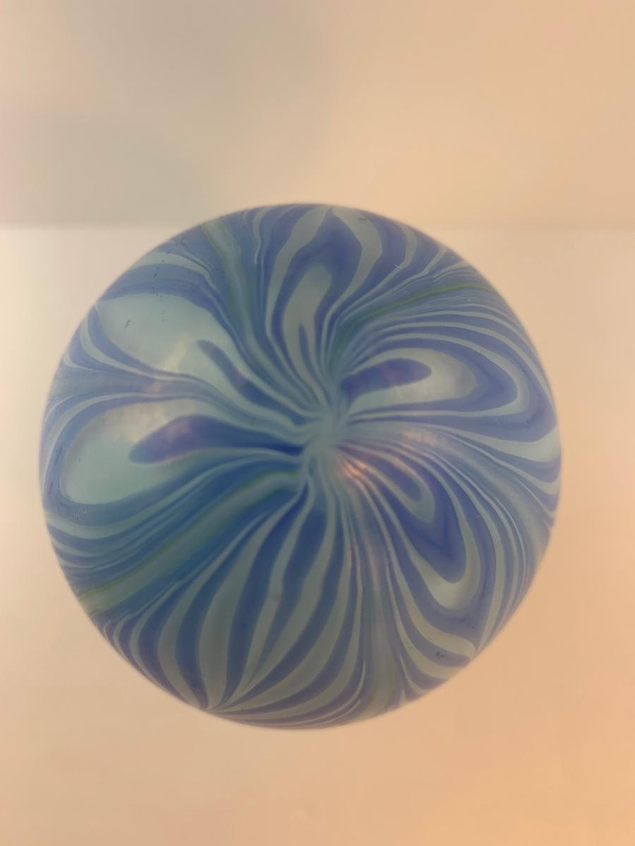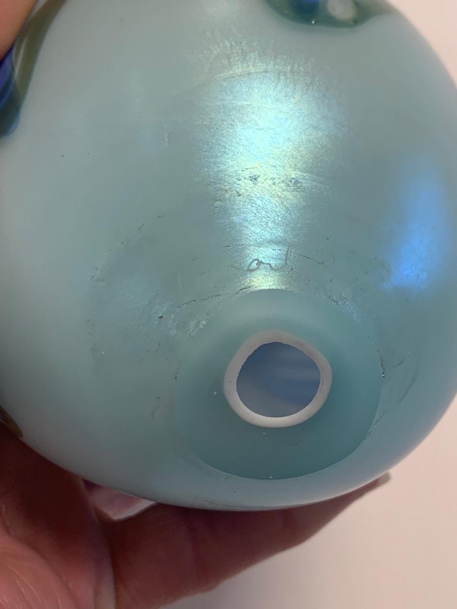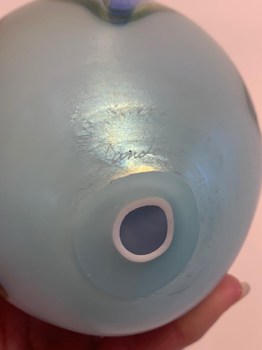 Vandermark signed feather pulled blue and gold on light blue base. Signed on bottom "Vandermark 1981" 3 1/2" x 5"