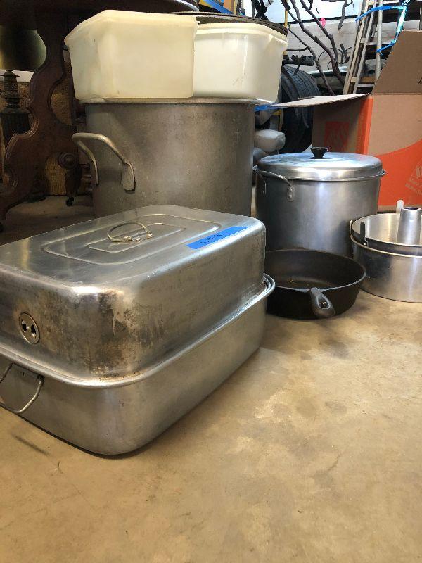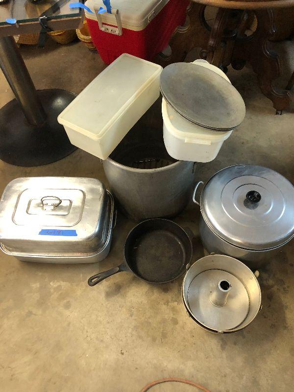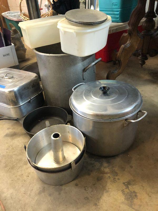 Crab pot, roaster, cast iron frying pan, bundt cake pans and other miscellaneous items.