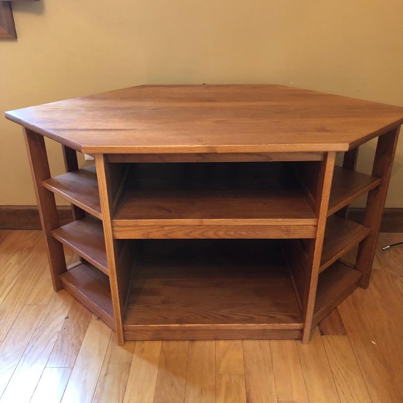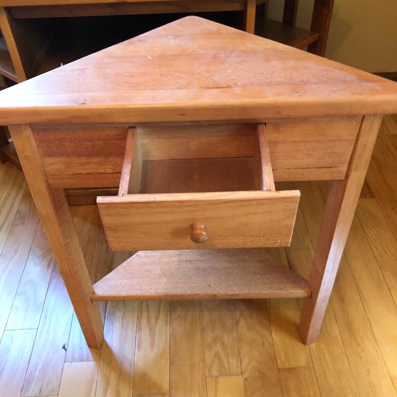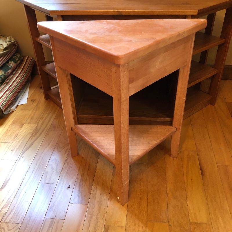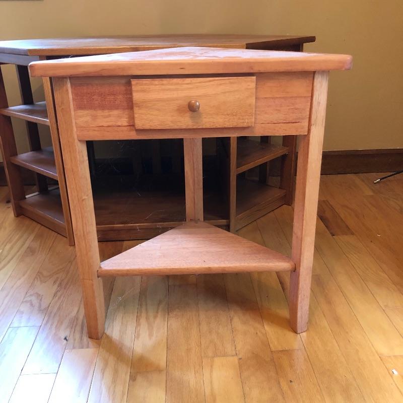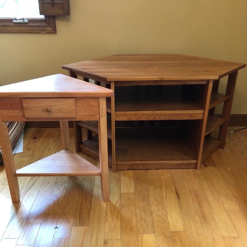 Great storage options with modern angular shapes make up these two great pieces of furniture. The larger of the two would be ideal as a small entertainment unit; it appears to be made from pressed wood in a mid toned color and has 2 center shelves with 3 small shelves either side. The smaller corner table is a slightly lighter color and has one small drawer. It has a few nicks that are shown in the last image.