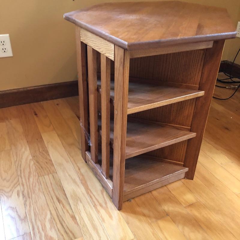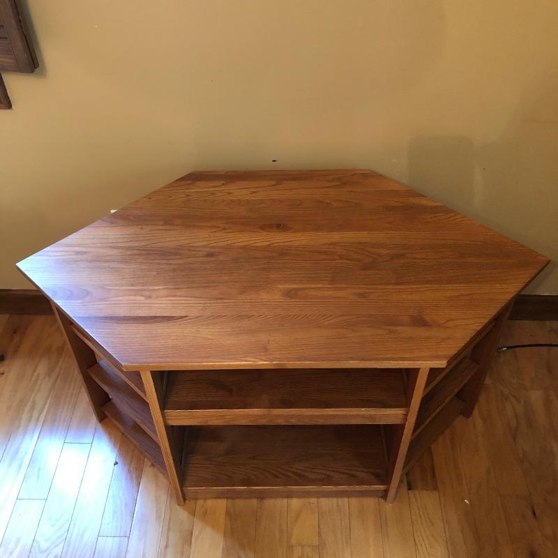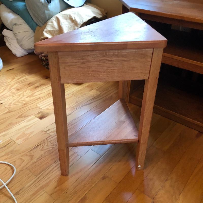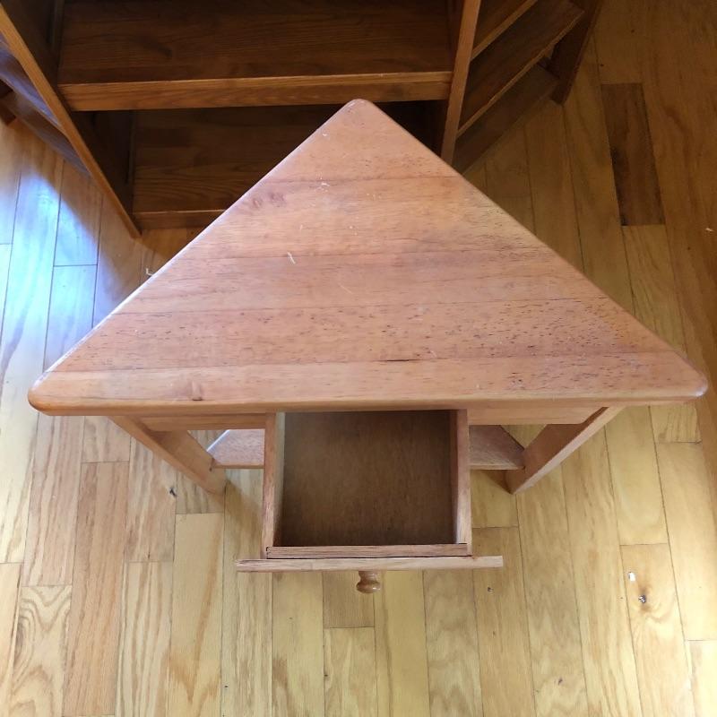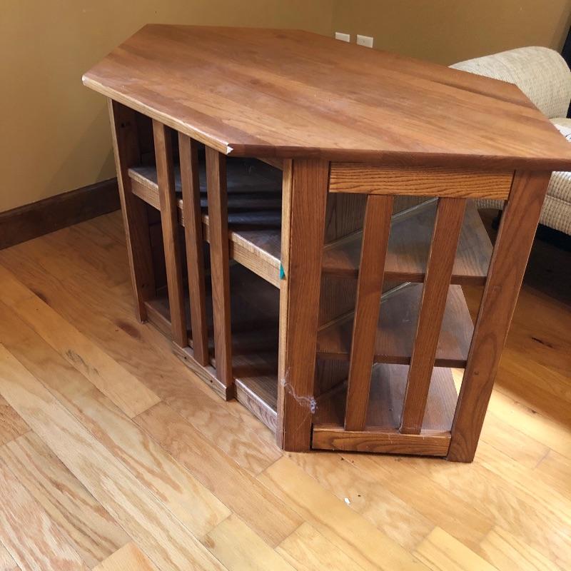Great storage options with modern angular shapes make up these two great pieces of furniture. The larger of the two would be ideal as a small entertainment unit; it appears to be made from pressed wood in a mid toned color and has 2 center shelves with 3 small shelves either side. The smaller corner table is a slightly lighter color and has one small drawer. It has a few nicks that are shown in the last image.