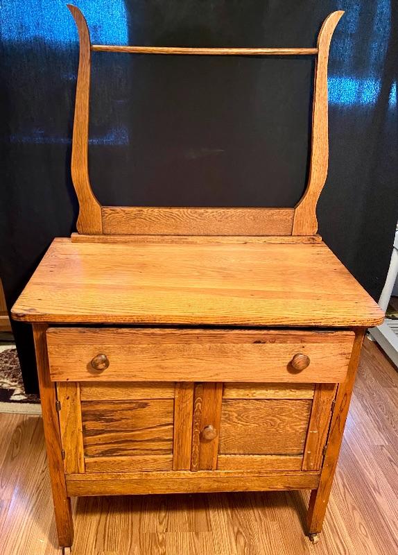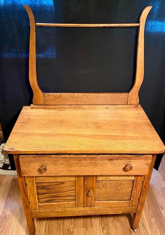 Lot 81: Antique oak 1800s washstand/dresser with towel bar 30Lx17Wx51H. MHW