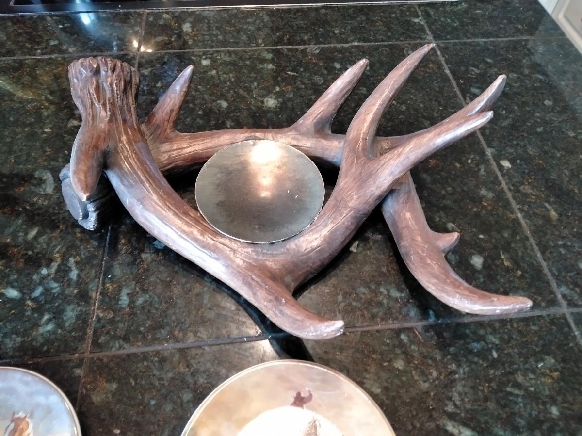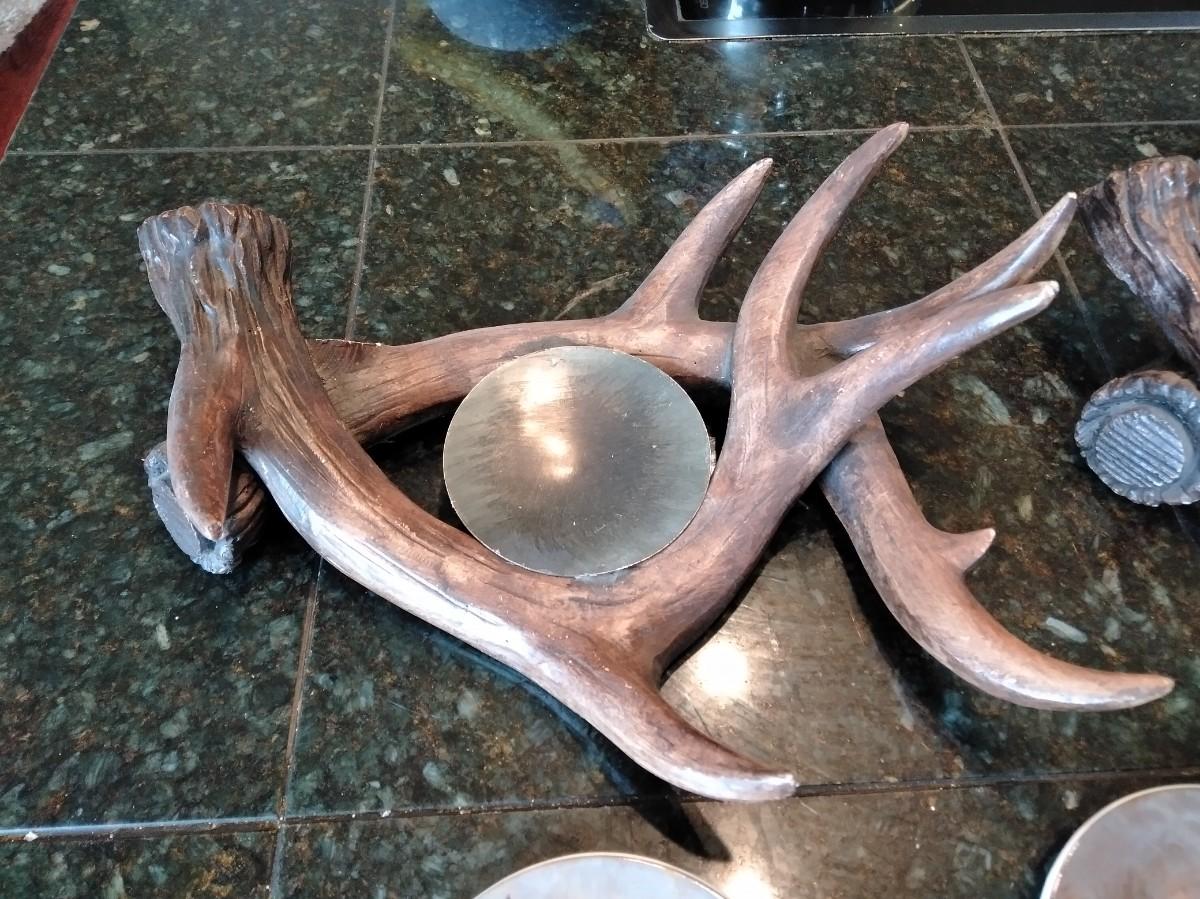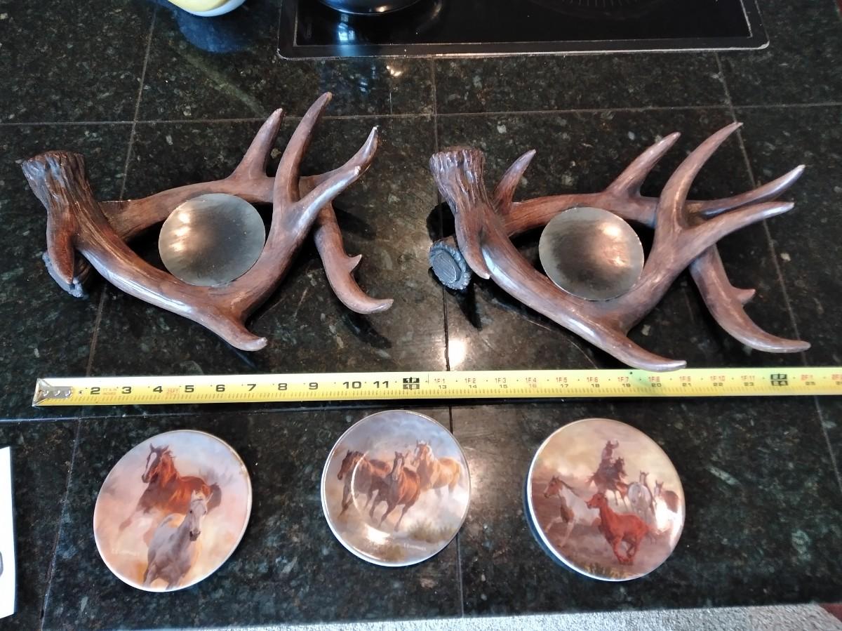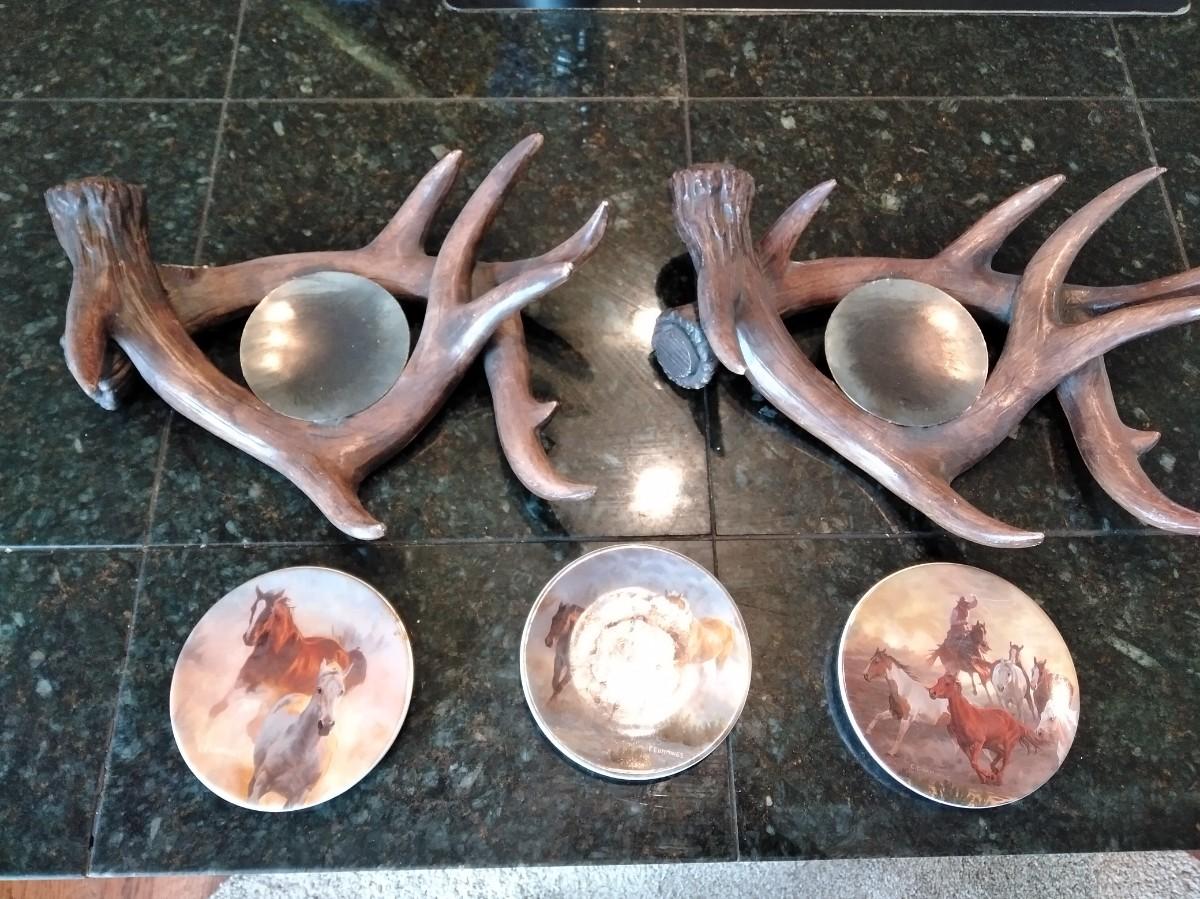 TWO MATCHING ANTLER CANDLE HOLDERS (one has damage) AND THREE SMALL HORSE PLATE / COASTERS.