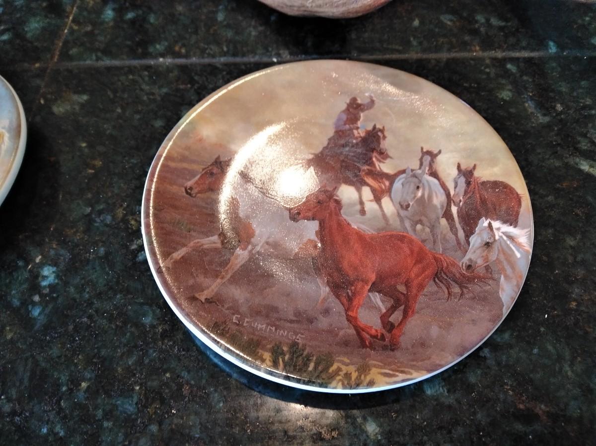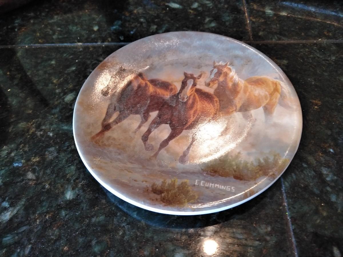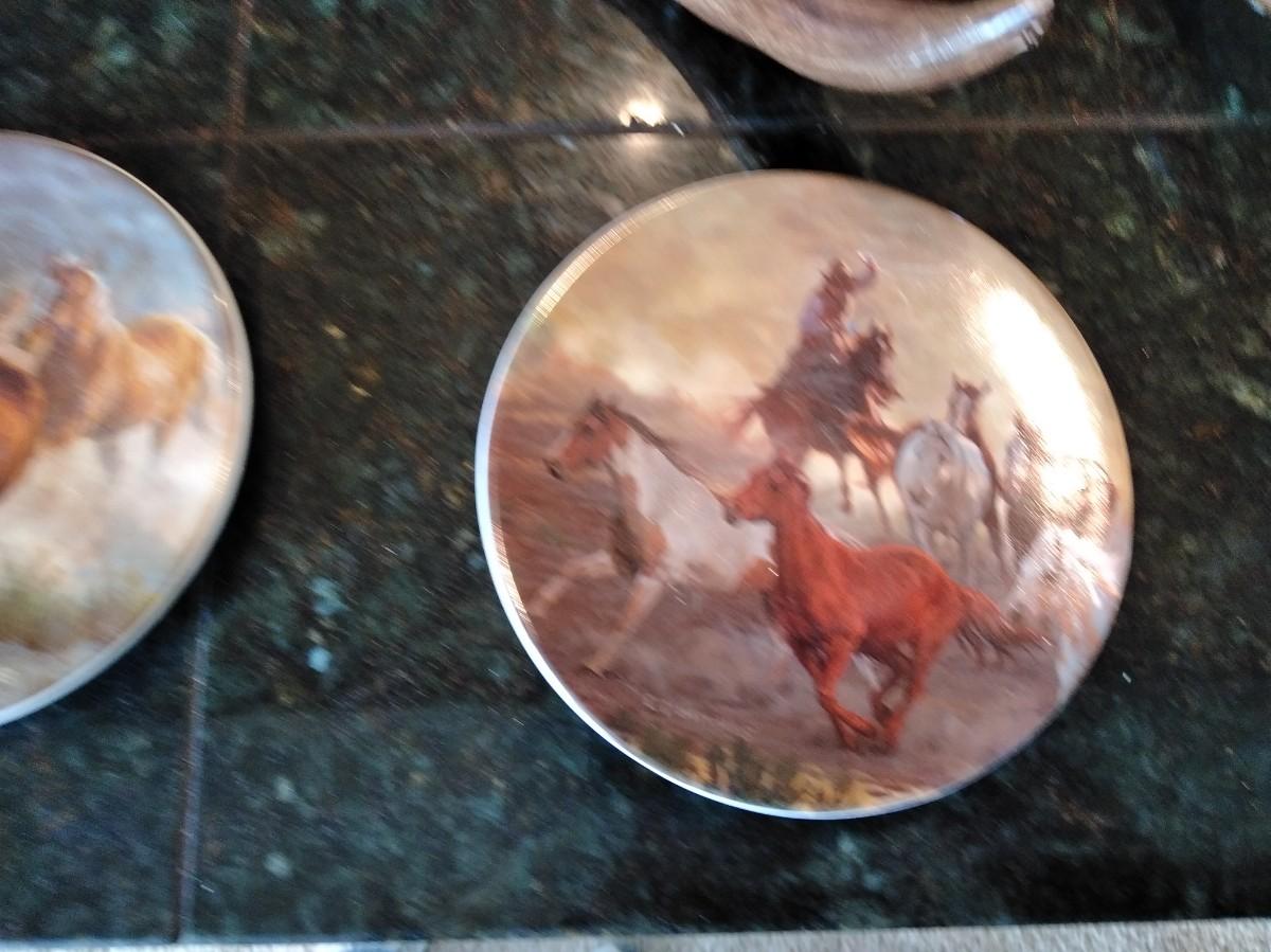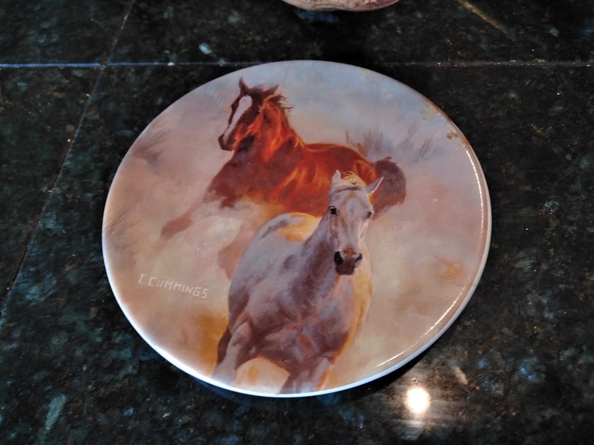 TWO MATCHING ANTLER CANDLE HOLDERS (one has damage) AND THREE SMALL HORSE PLATE / COASTERS.