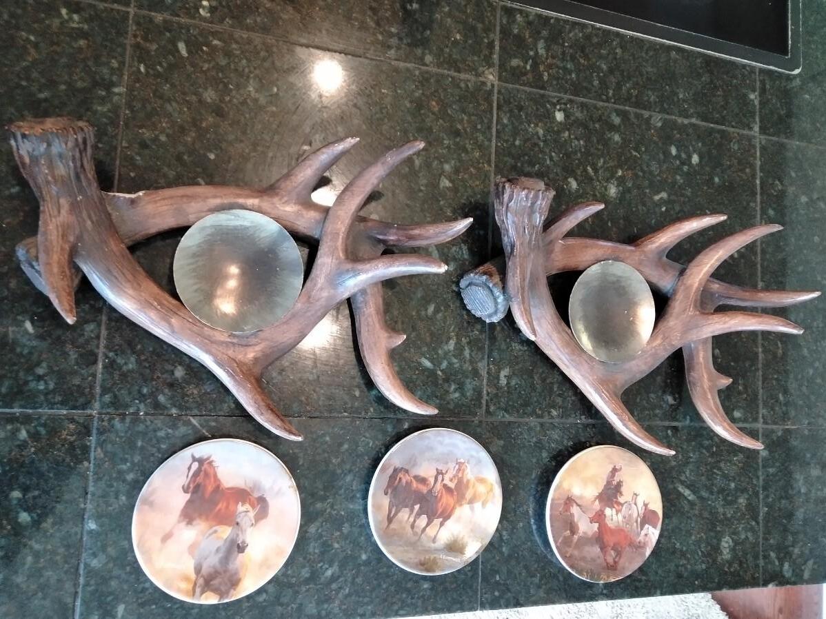 LOT 81 ANTLER CANDLE HOLDERS AND SMALL HORSE PLATES (W)