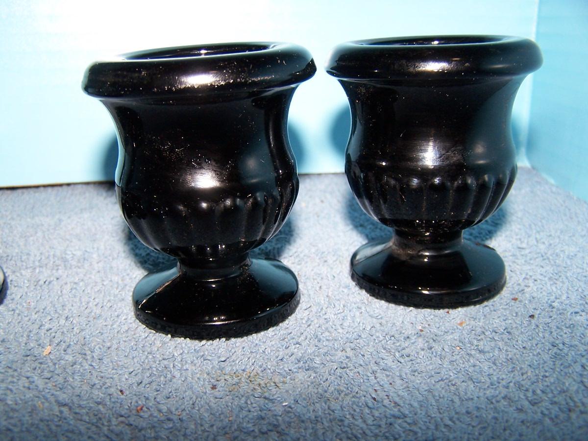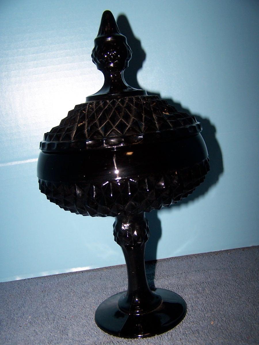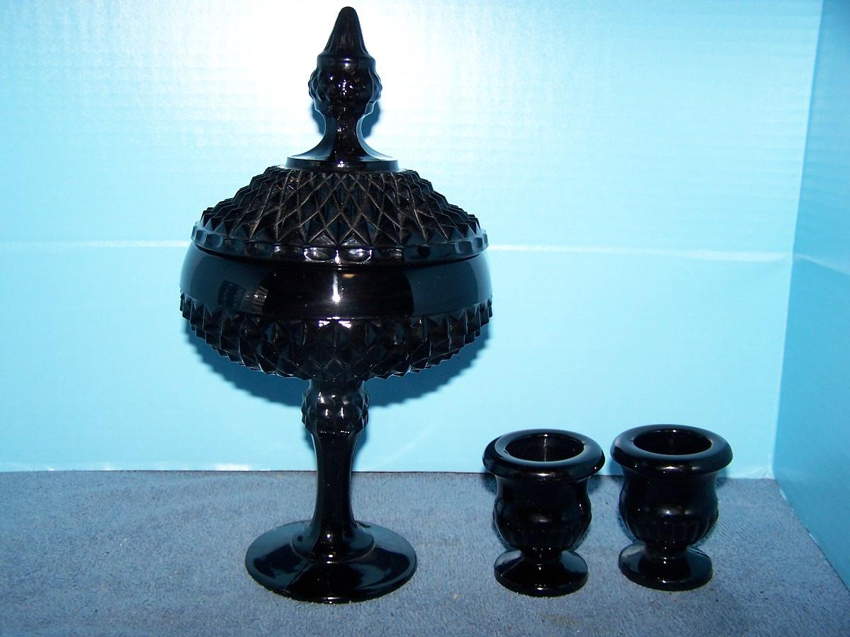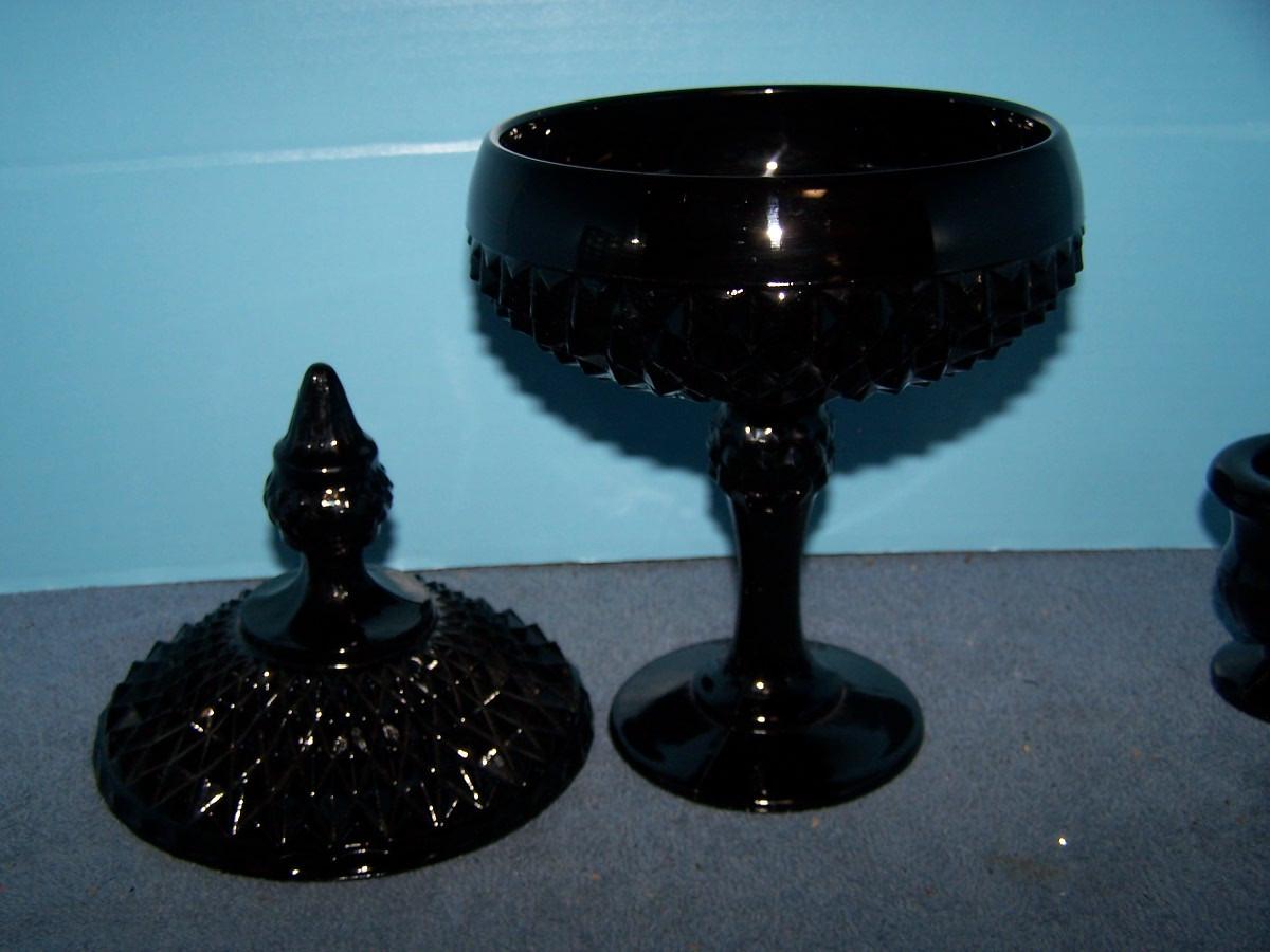 THIS IS BEAUTIFUL BLACK AMETHYST GLASSWARE!!! UNMARKED. THE CANDY JAR IS INDIANA GLASS AND IS 12 1/2'' TALL. LIGHT WEAR..
