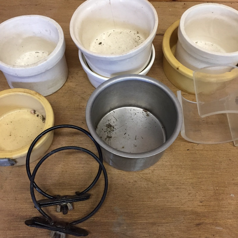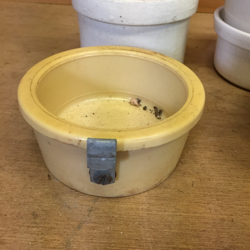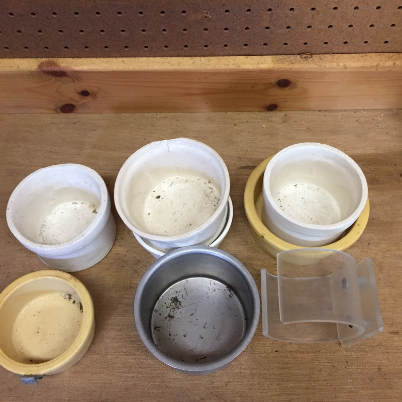This assortment of bowls can be used for a birdcage or for other pets. Also included are a couple of brackets to hang the bowls.