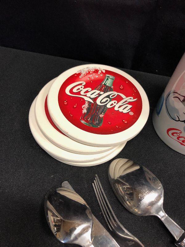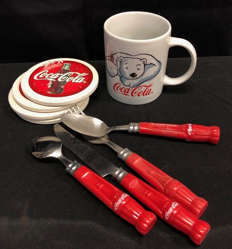 LOT 81 - COCA-COLA COLLECTIBLES: Coasters, cup, utensils