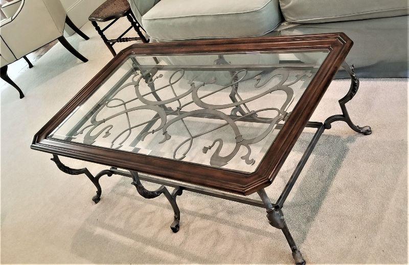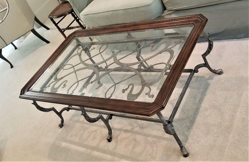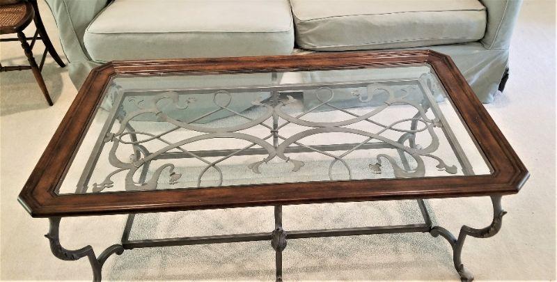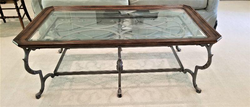 Very stylish coffee table - Wooden gallery edge, tempered glass top, wrought metal frame and legs. Quite pretty and in excellent condition. 52" x 30", 18" tall.