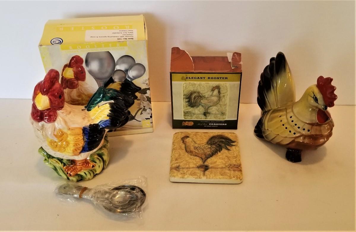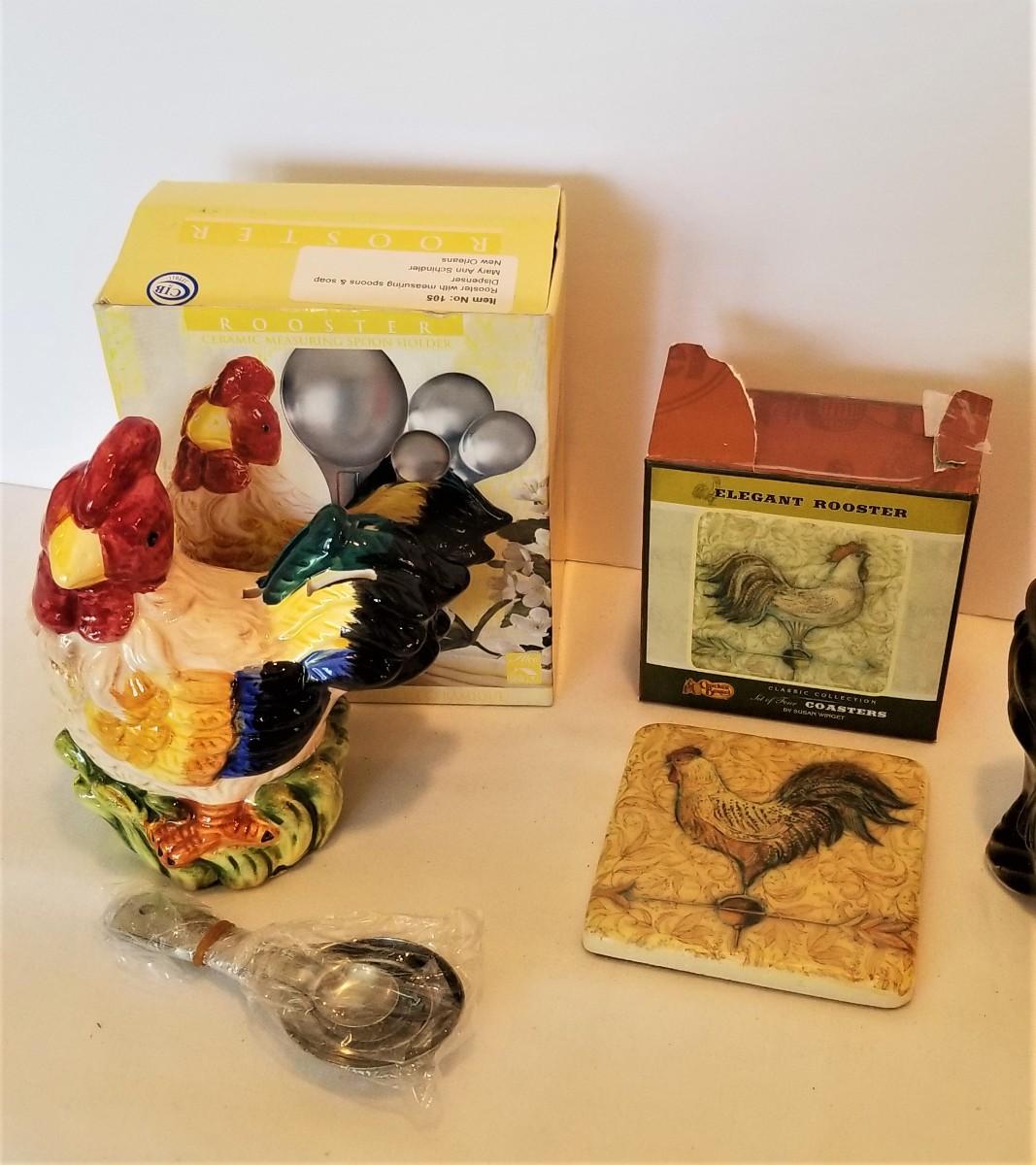 Like chickens????? You get all you see here - new chicken-themed measuring spoon holder w/spoons, package of stoneware coasters, and a chicken toothpick holder. All in good condition.