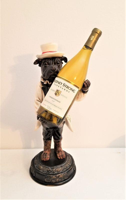Perfect for your home bar - contemporary heavy resin Bulldog bottle holder. Stands 18" tall, good condition. Note: the wine bottle is a prop and is not included in the price.