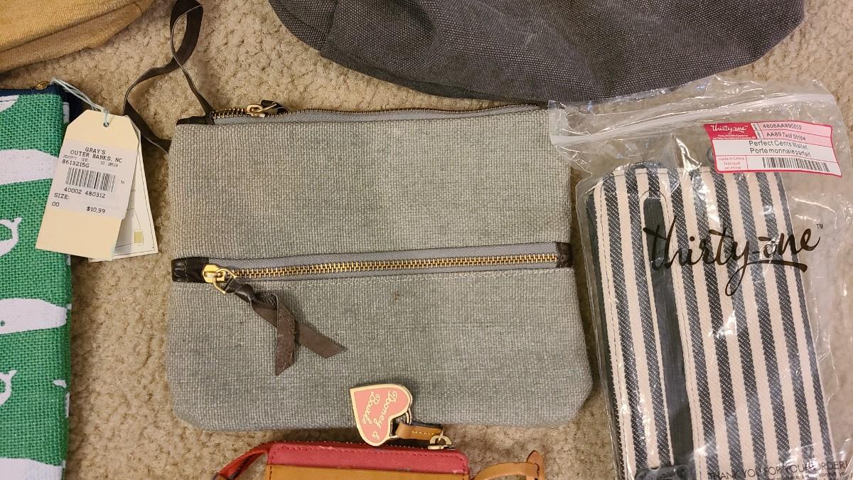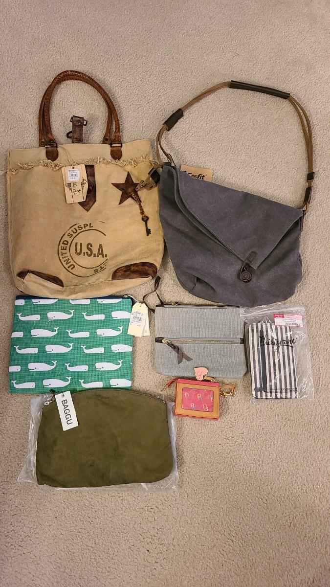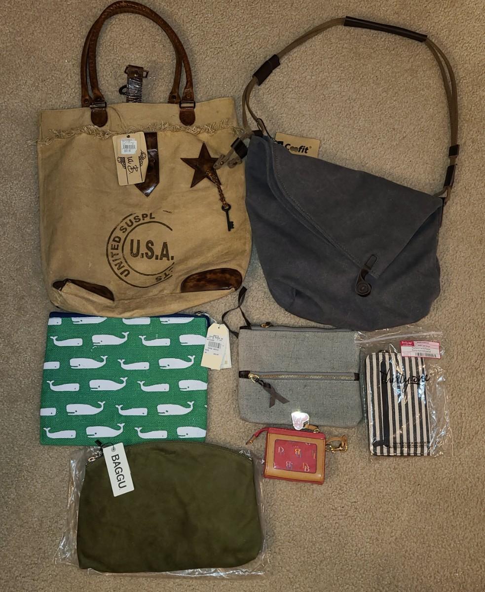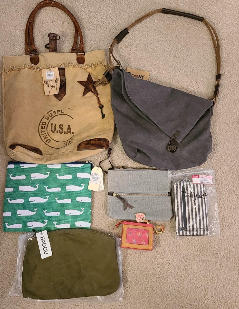 Nice lot of handbags: Dooney Coin purse, Mudpie Makeup Whale bag, New Suede clutch, 2 New Boho Canvas Fashion Totes, and more. Please see all pictures for content of the lot, condition of the lot, and measurements if taken. Pictures are the best representation of the items listed and items are untested unless indicated in description. Thank you for looking and have fun bidding!
