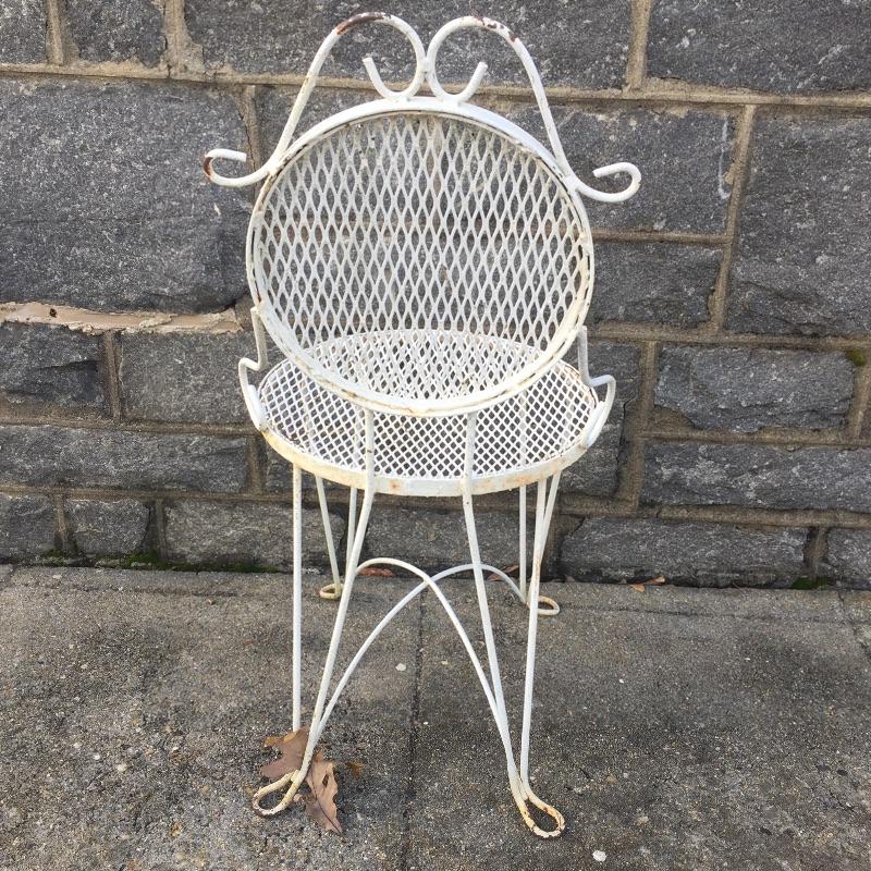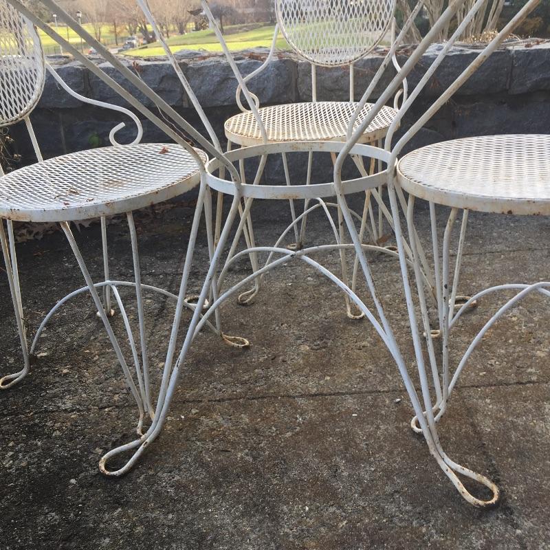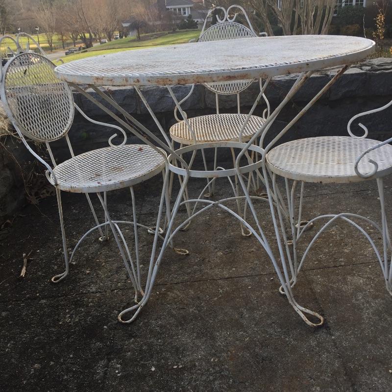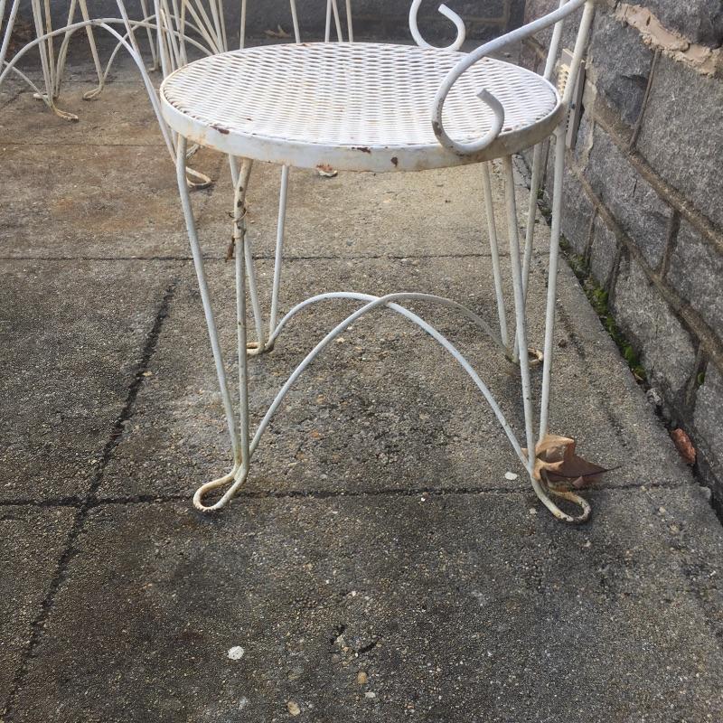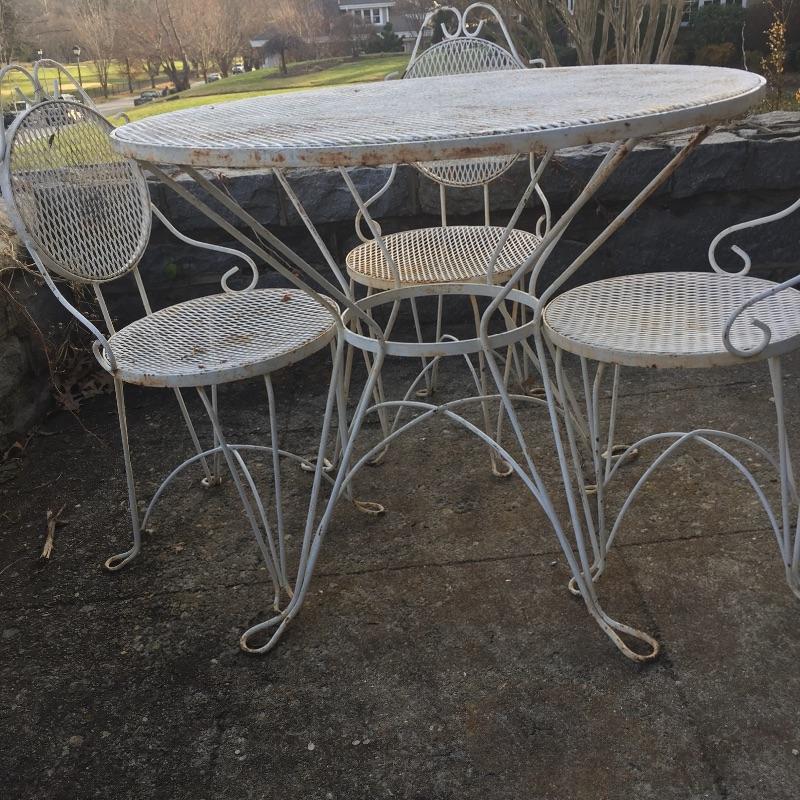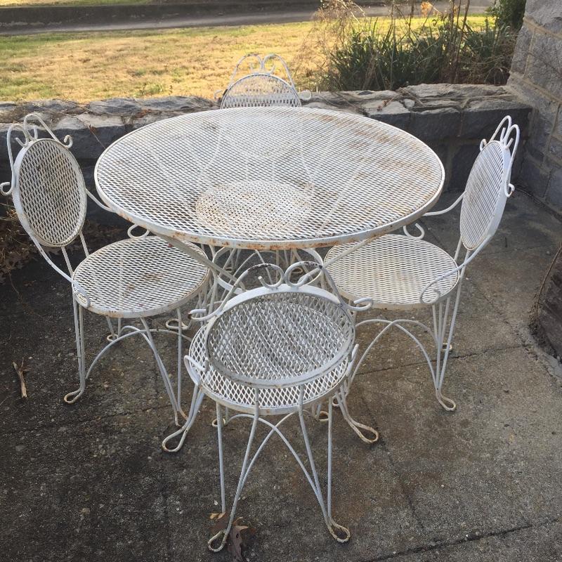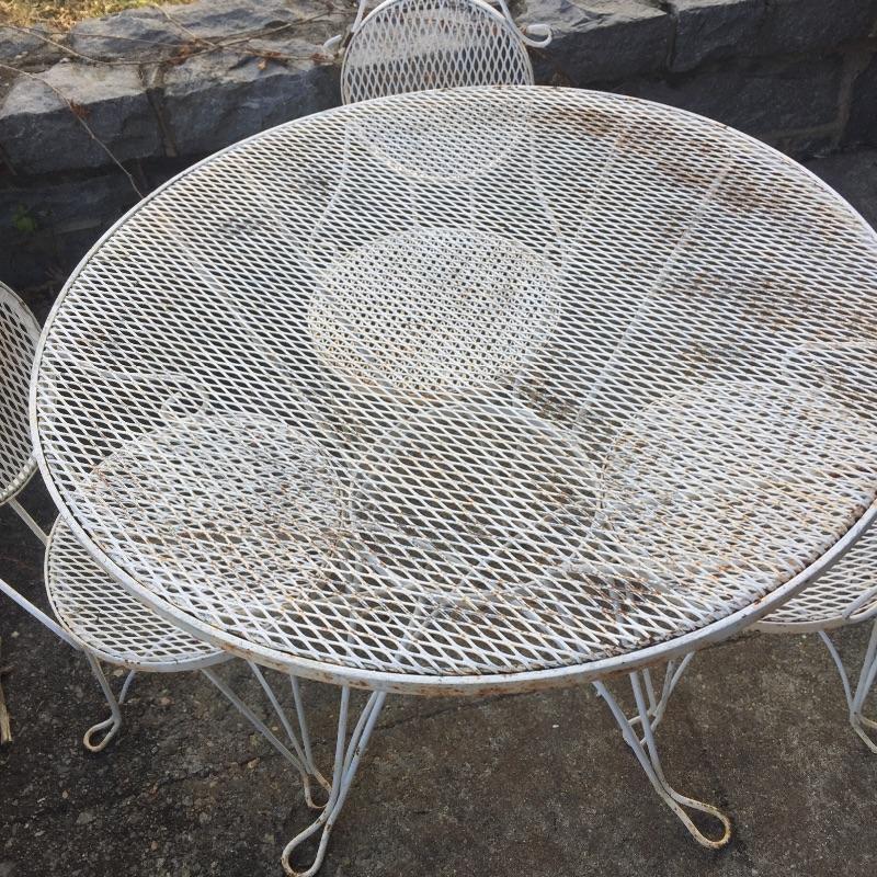 Lovely five piece iron patio set. Wire mesh topped table with four chairs. Has surface rust but in solid shape just needs a quick paint job to make it like new. Table measures 35”D. 30” tall. Chairs measure 17” x 15” x 33”. 16” seat height.