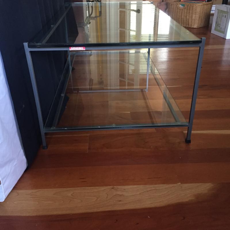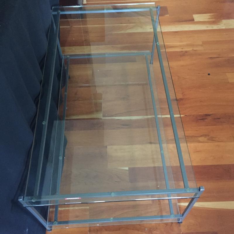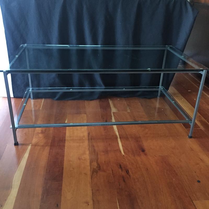 Substantial glass and steel coffee table. This coffee table has a classic style for your home. Glass comes off to move. Table measures 23.5” x 42” x 16.5”