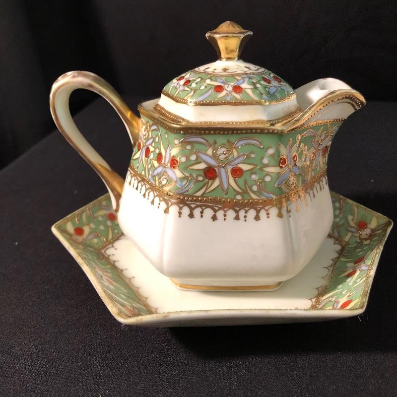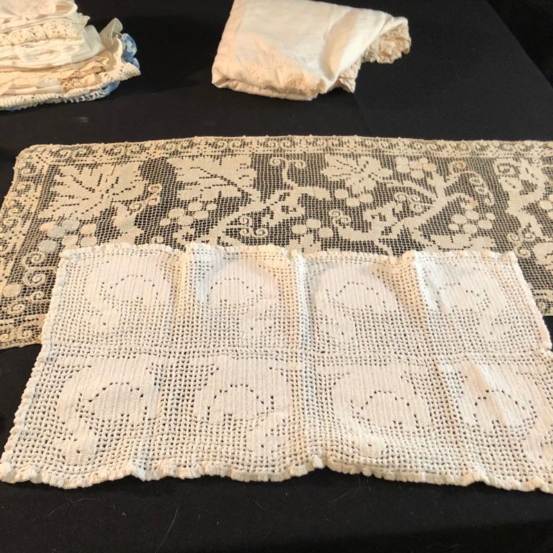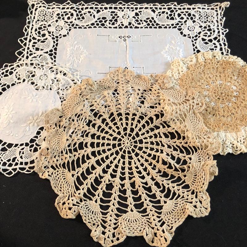 This eclectic assortment of home accents includes a hand-painted Nippon China lidded creamer with matching saucer, 2 small glass salt and pepper shakers, a slew of vintage table linens and an antique small brush and dustpan. The linens include a round table cloth, napkins, lace table runners, doilies and more.