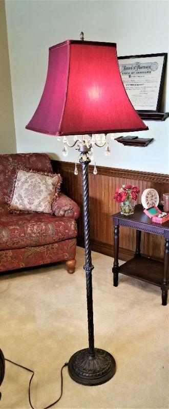 Very nice floor lamp here, nice and heavy - features 15 hanging crystals. Uses 3 chandelier bulbs. Has nice long cord. Measures 66" tall.