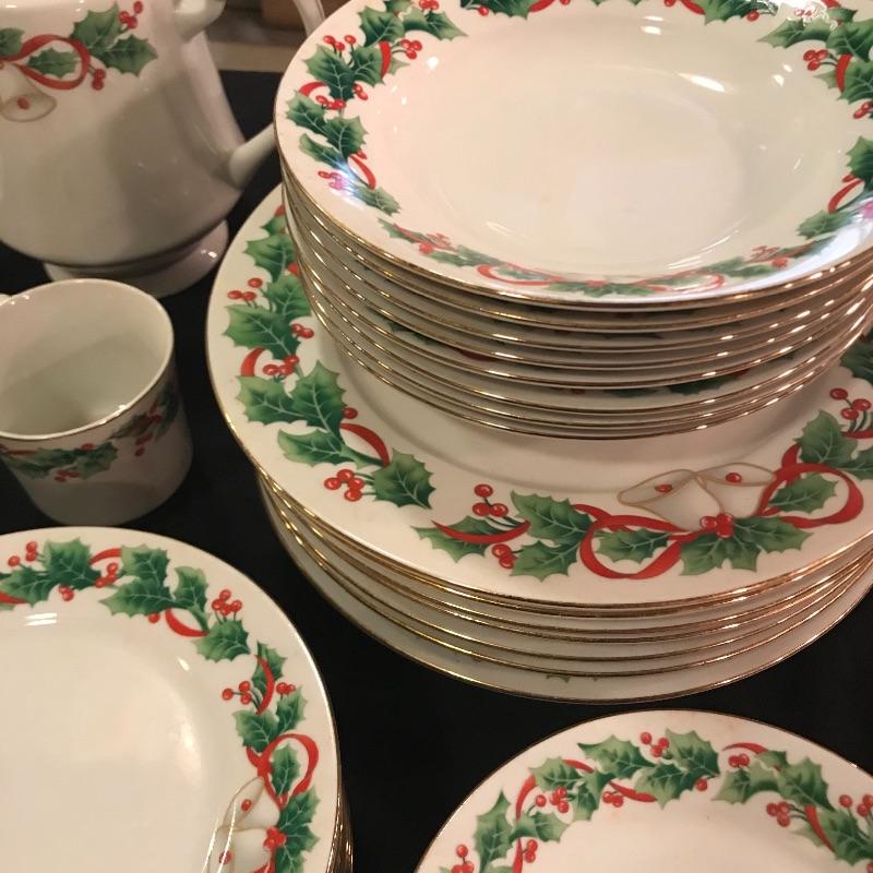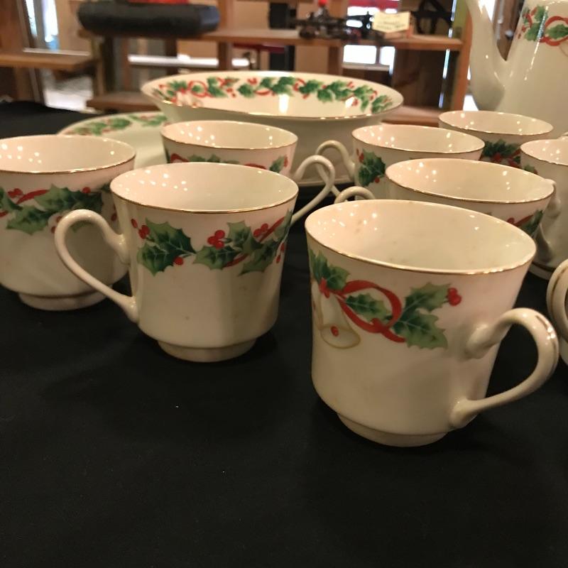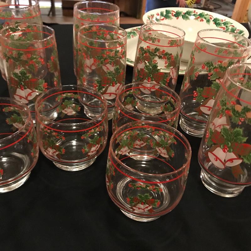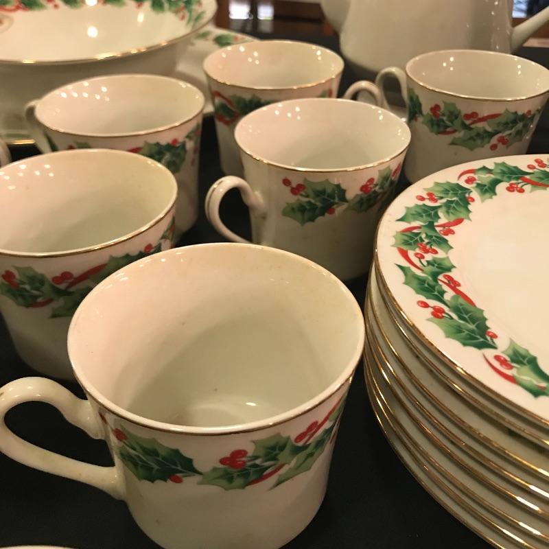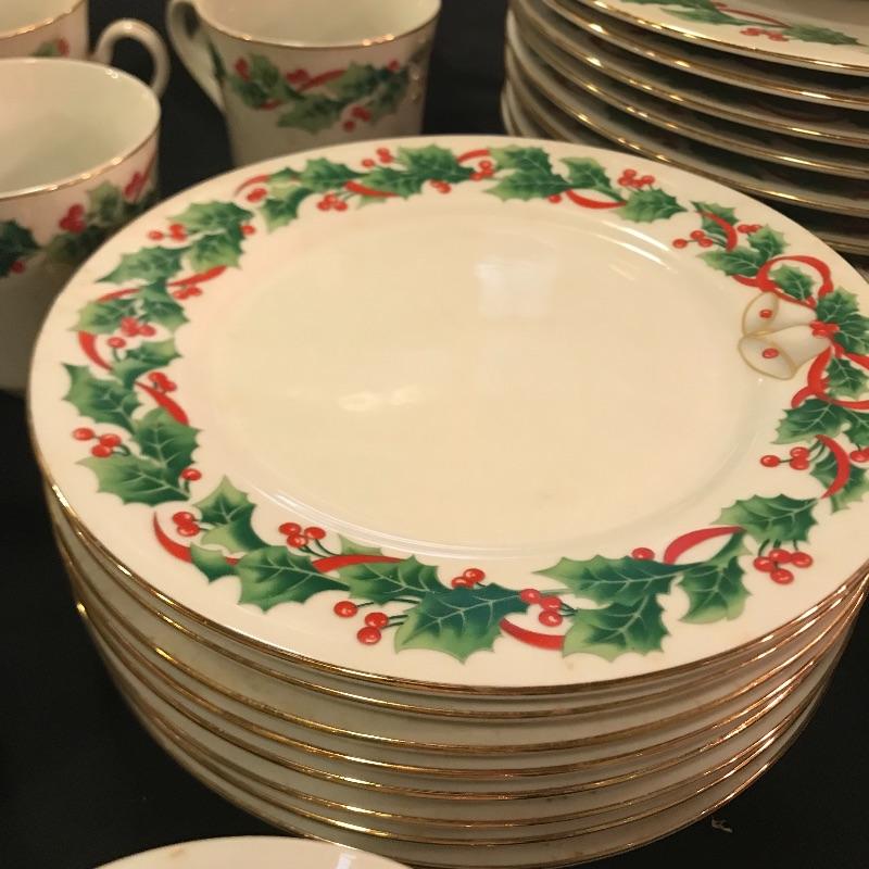 Lot includes Sango holly print china set and holly print glasses. China set includes serving tray and bowl, 11 teacups, a teapot, sugar bowl and creamer, 8 salad plates, eight saucers, eight soup bowls, and eight dinner plates. Holly glasses include four small, four medium and four large. See pics. Local pickup only.