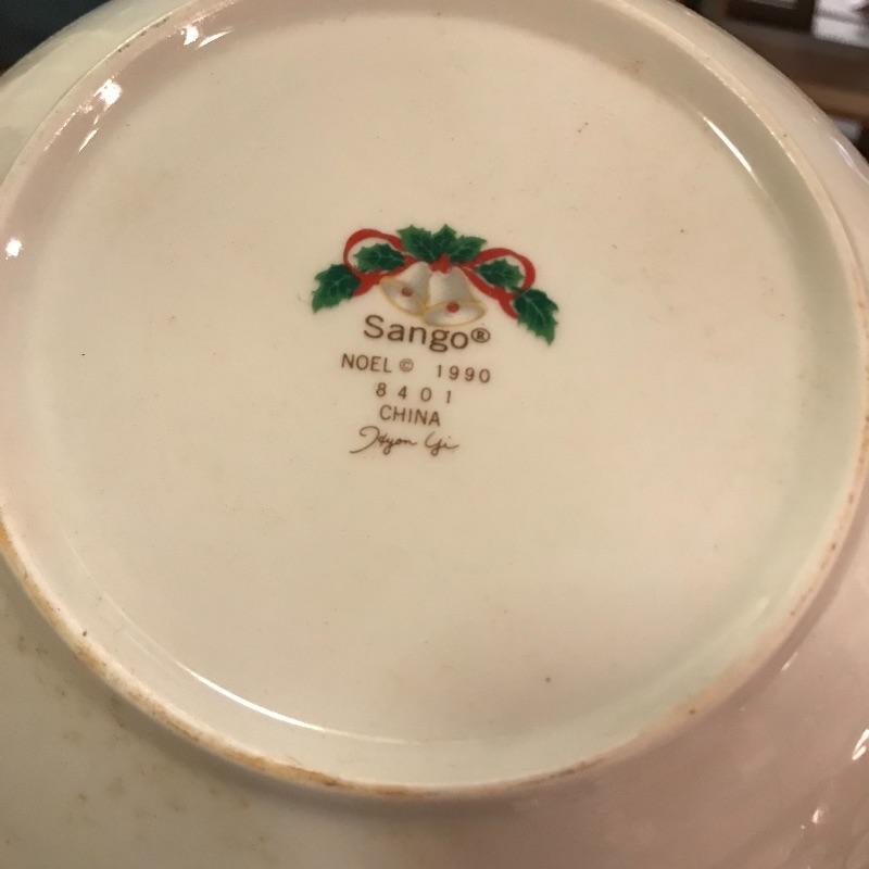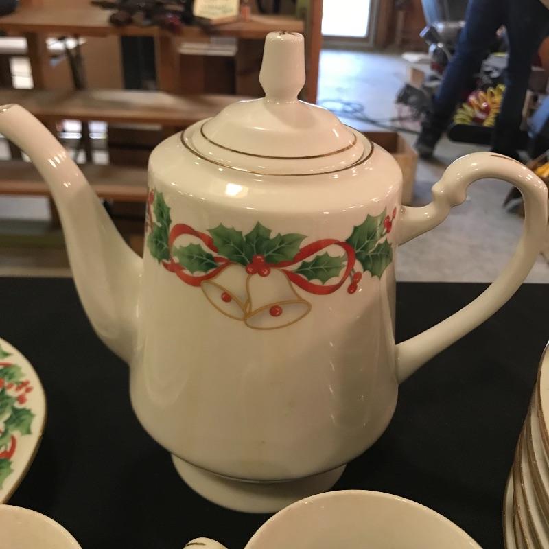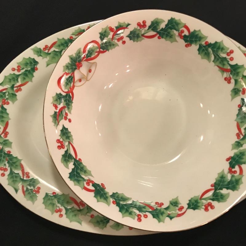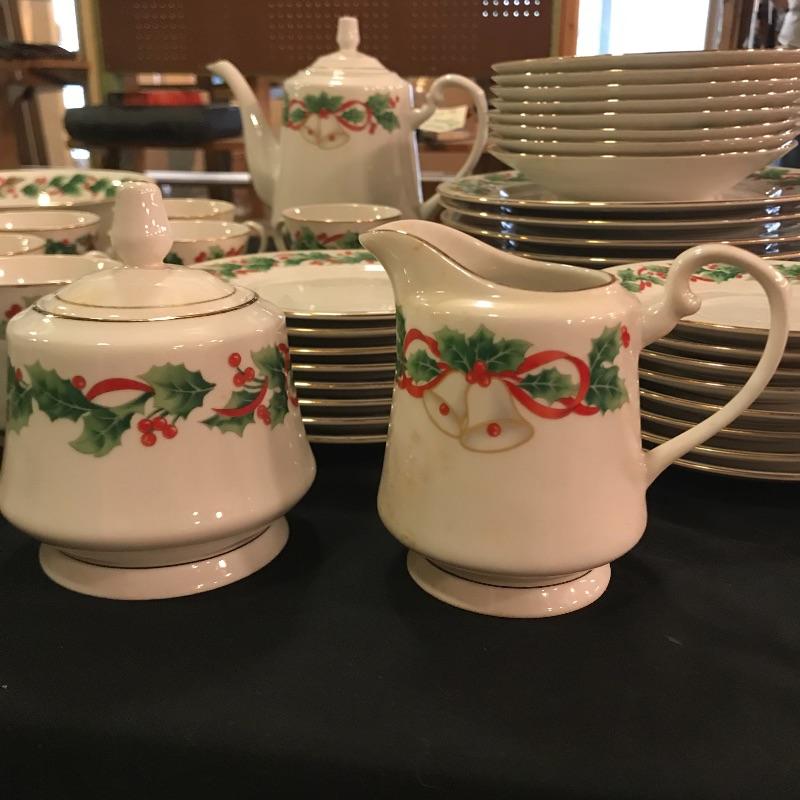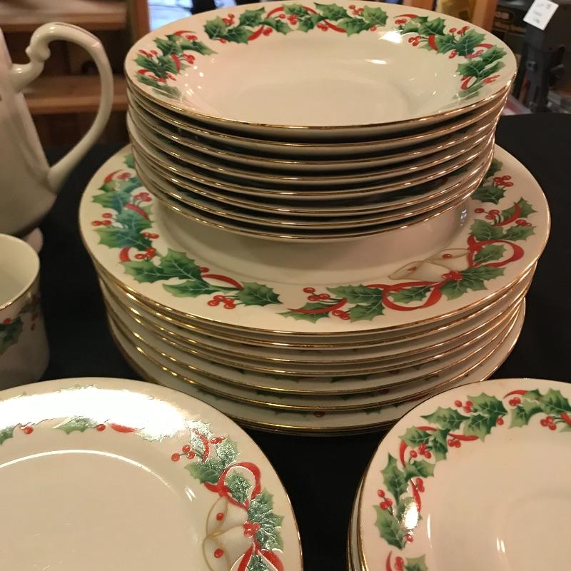 Lot includes Sango holly print china set and holly print glasses. China set includes serving tray and bowl, 11 teacups, a teapot, sugar bowl and creamer, 8 salad plates, eight saucers, eight soup bowls, and eight dinner plates. Holly glasses include four small, four medium and four large. See pics. Local pickup only.