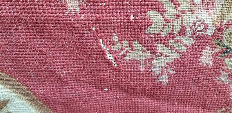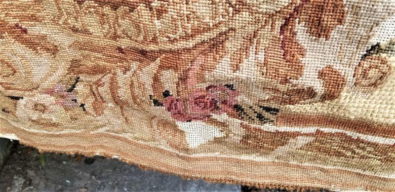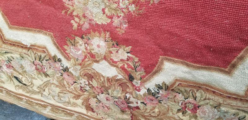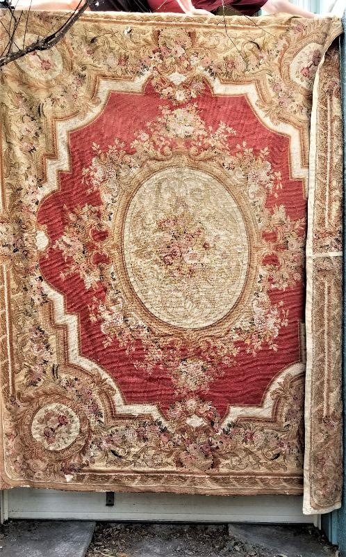 This large (113" x 94") antique Aubusson style needlepoint rug is actually quite beautiful. Has a few losses mostly near the edges where furniture would be placed over it. Has been rolled up and could use some airing and a clean to get the dust out. This rug is as good as many I've seen at local plantation homes and historic houses. Definitely 19th century - lovely pattern. Hard to photograph so we hung it over the balcony. The dust really flew but if you gave it a gentle vaccuming and took it for a light clean you would really have a nice rug.
