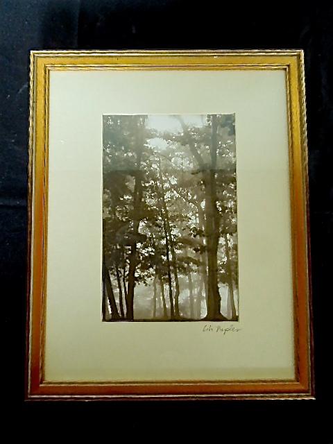 Signed Lili Naples photograph of grove of trees in brown black tones with gold frame. Outer dimensions of frame are 15 x12. Ready to hang.