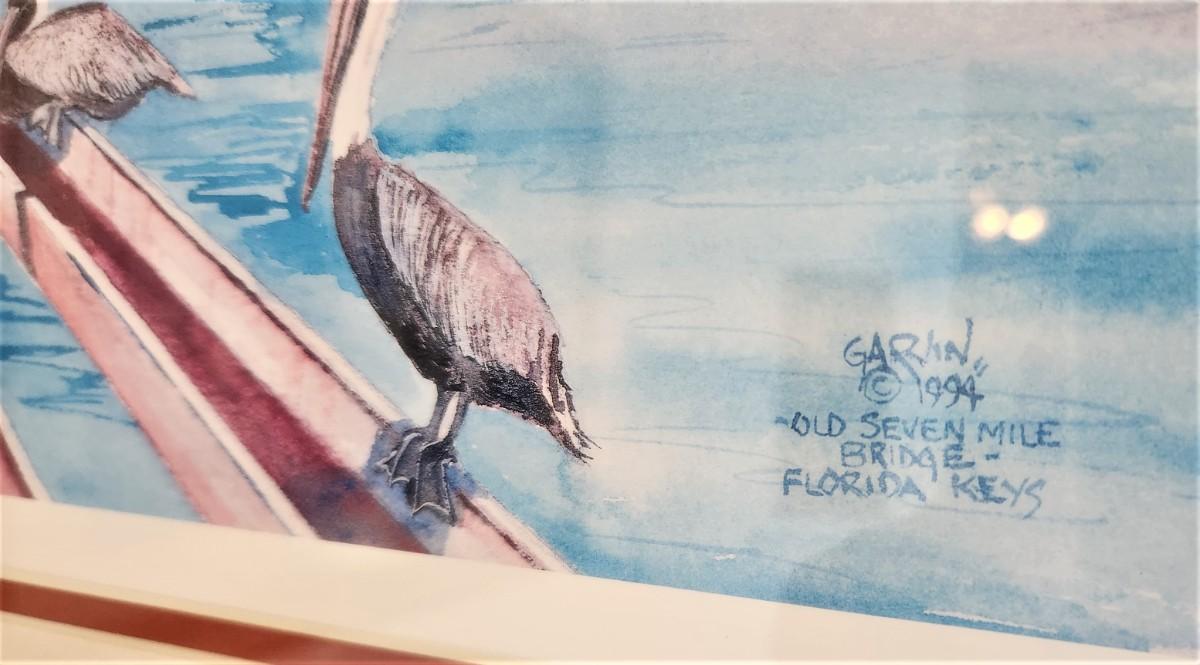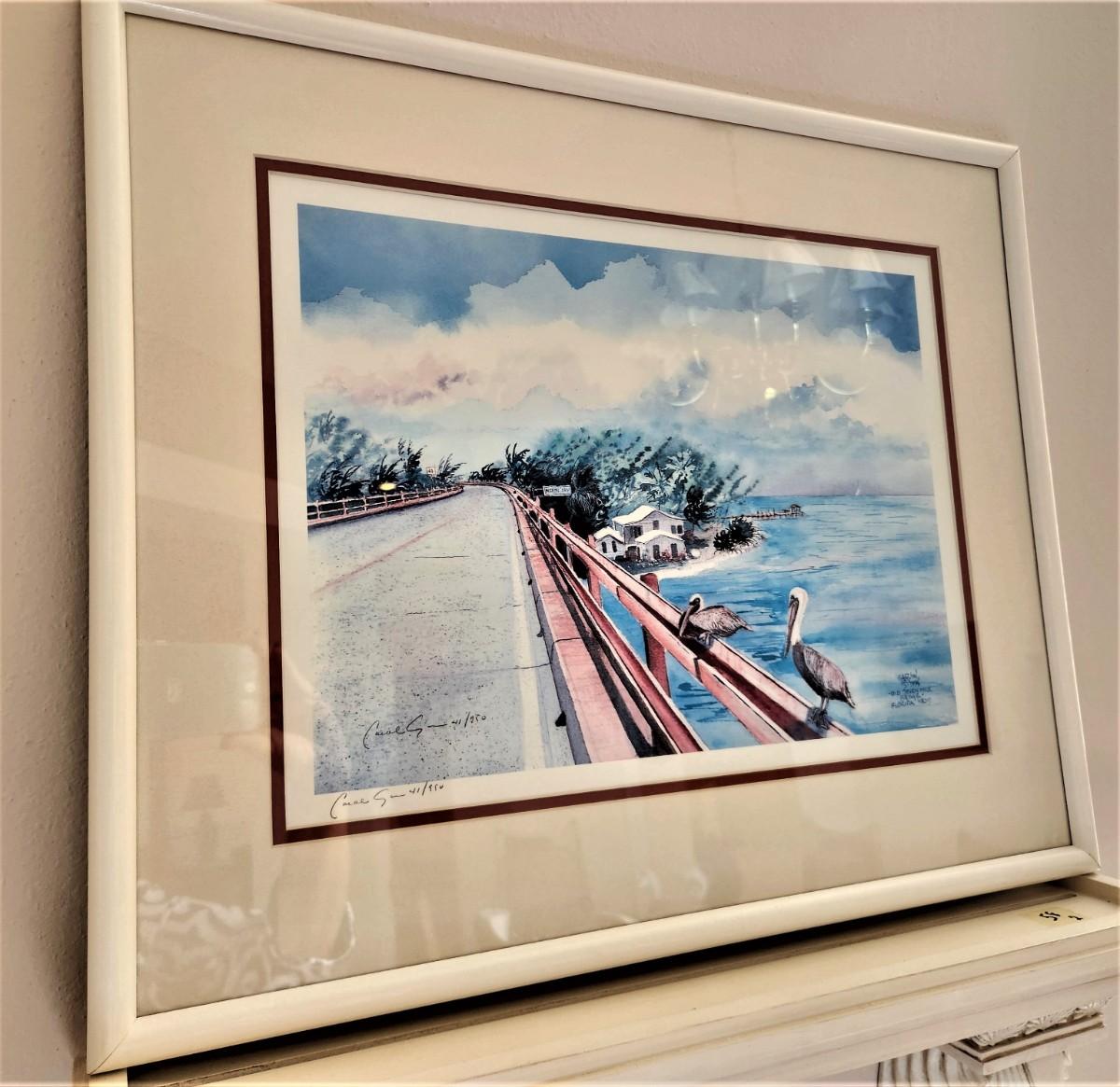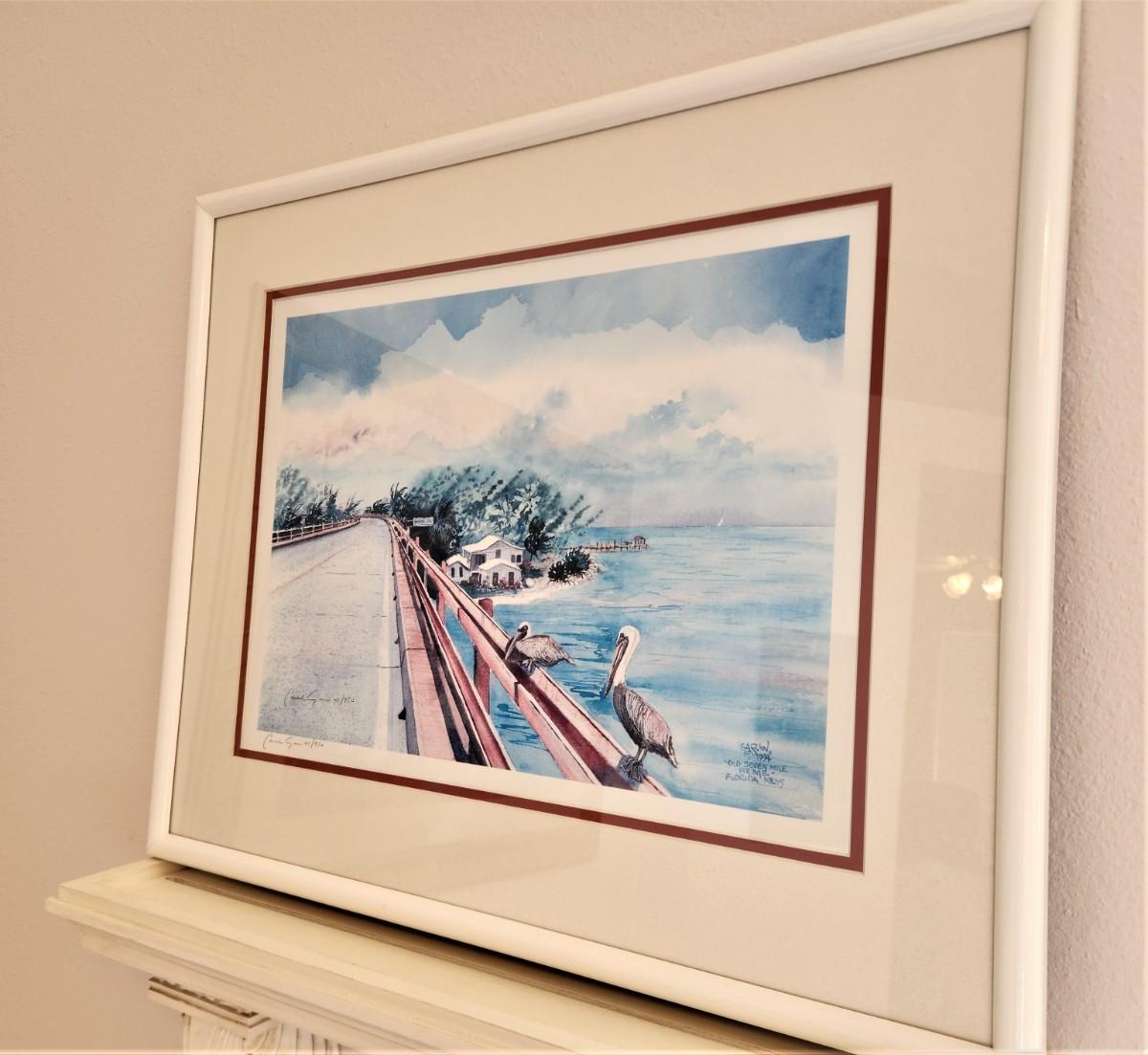Attractive print featuring Pelicans perched along a sunny bridge - #41/950, pencil signed (can't make out the artist) - entitled "Seven Mile Bridge - Florida Keys." Double mat, done in 1994. 21.5" x 17.5".