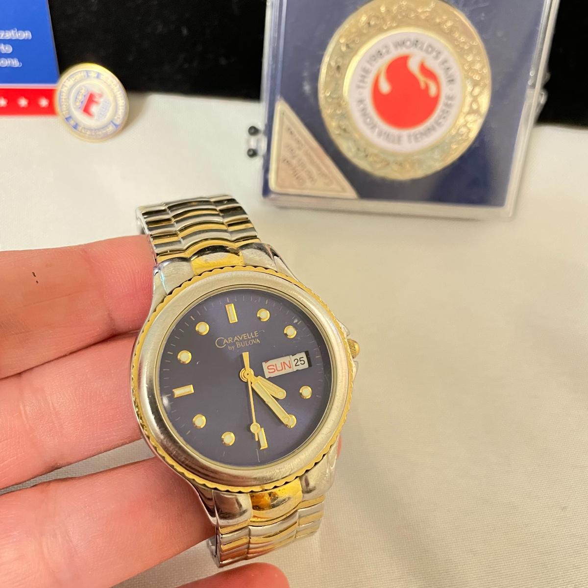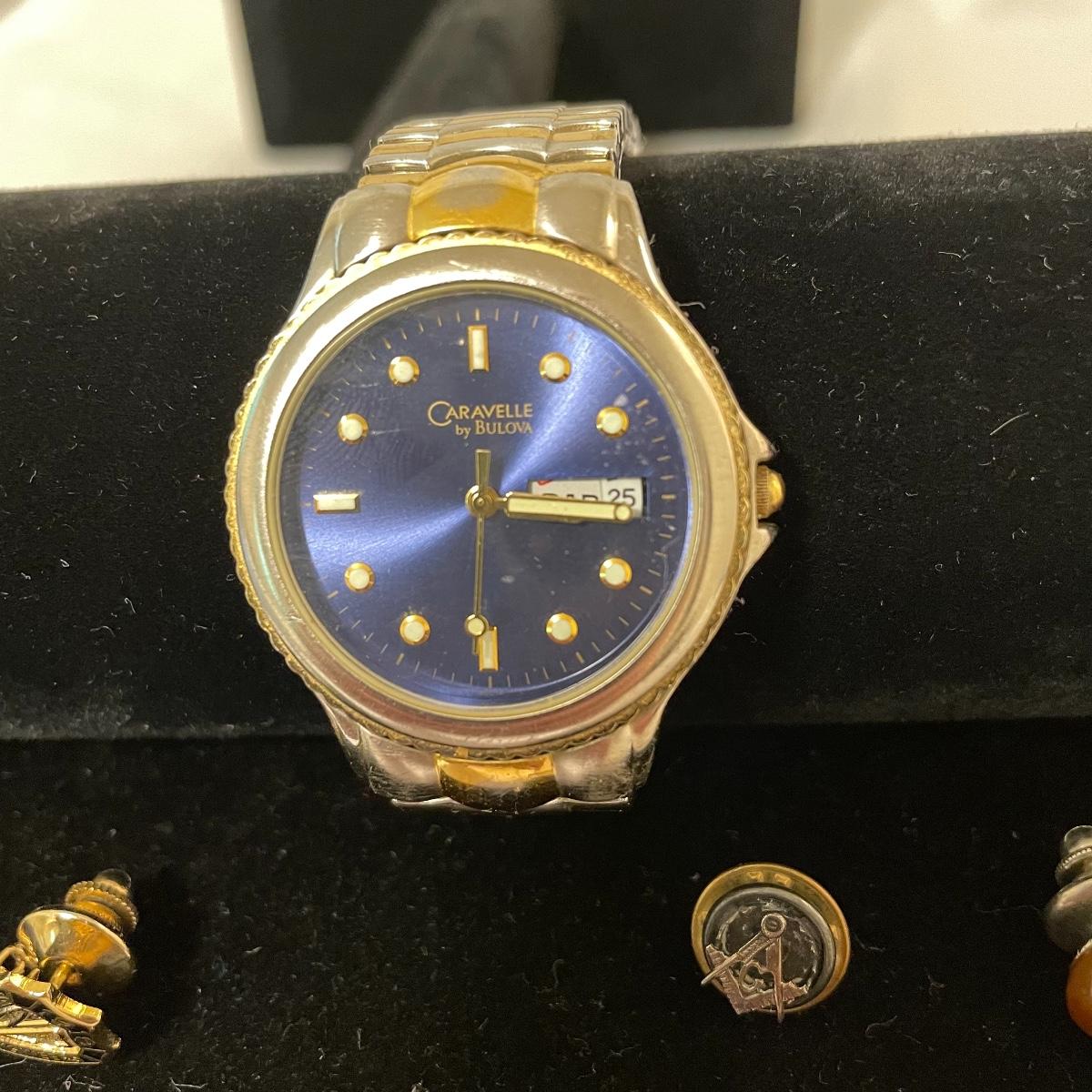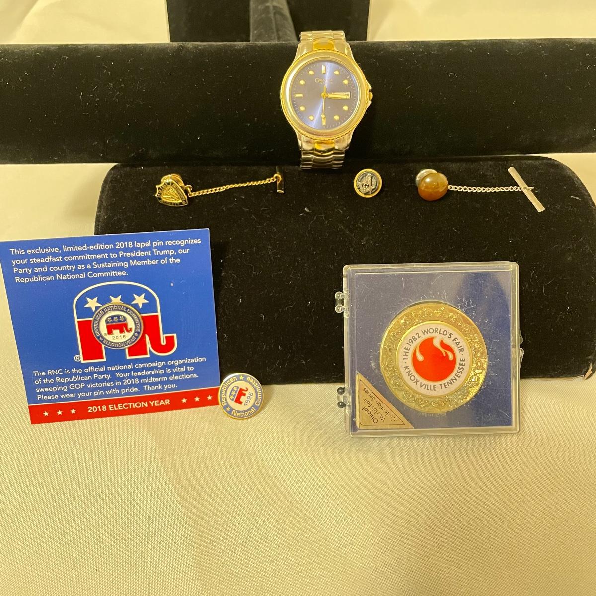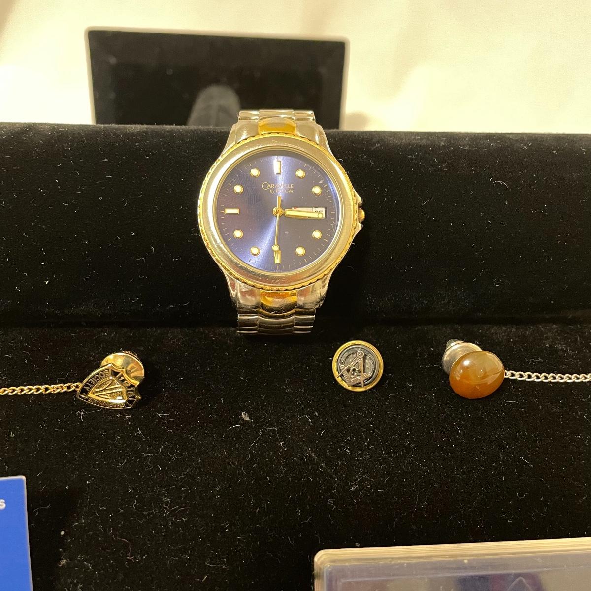Lot 81 - Men’s Bulova Watch with Pins and Collectibles