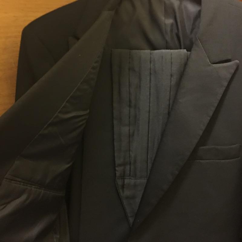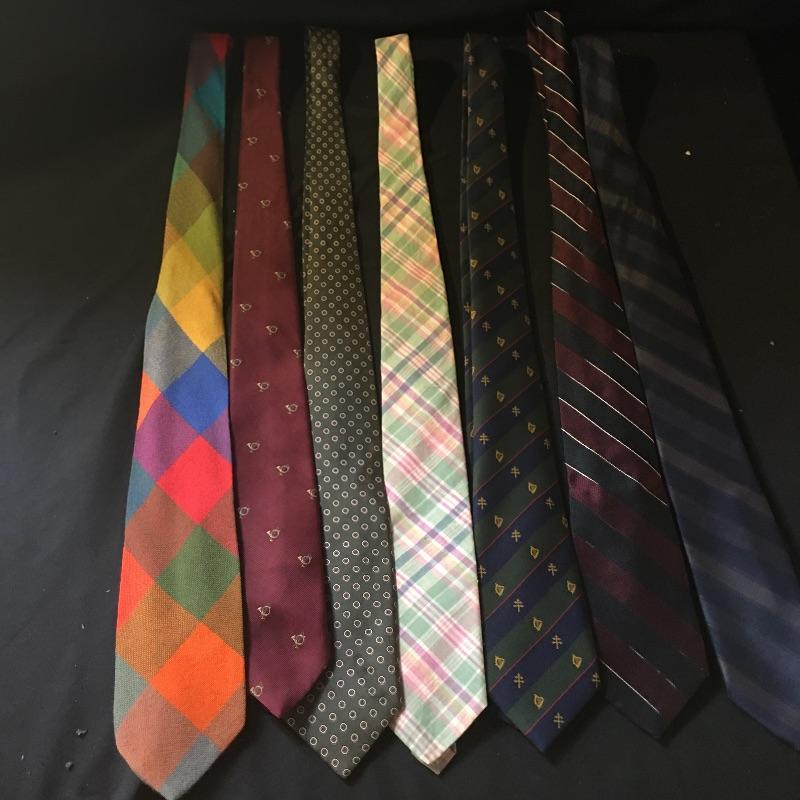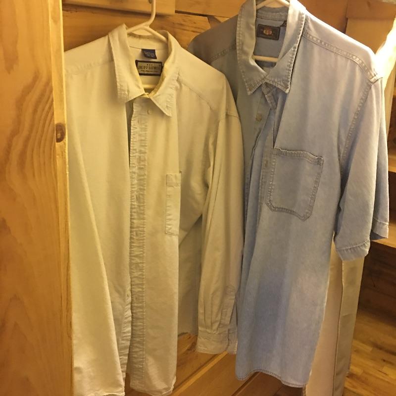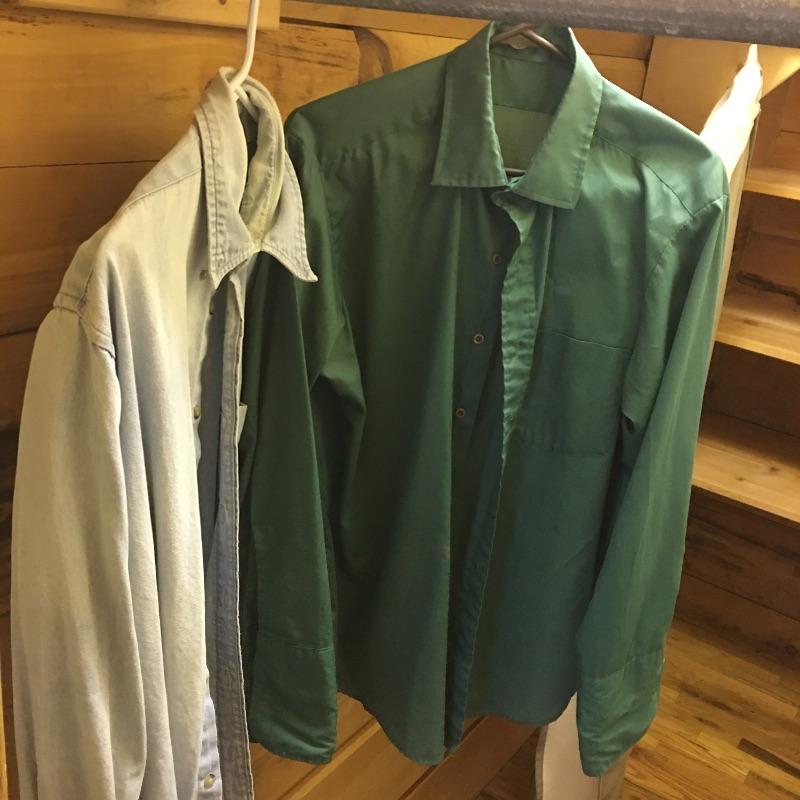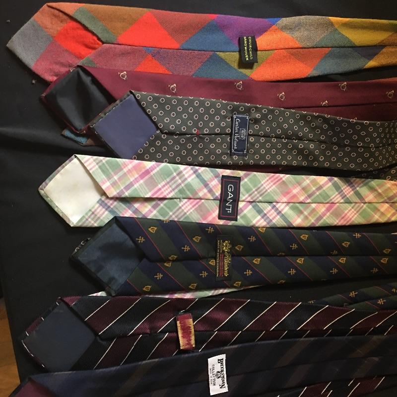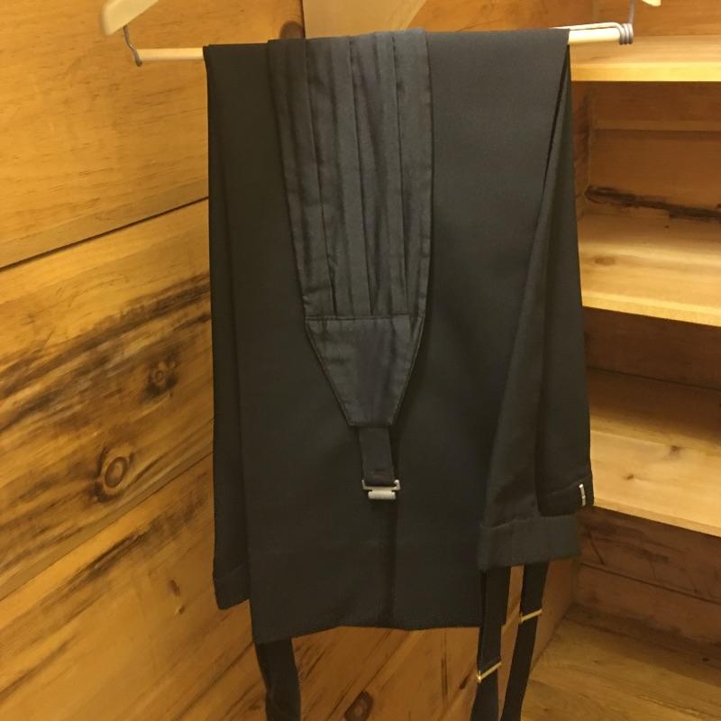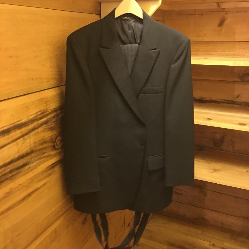 Look sharp with this collection of men’s clothing. Includes After Six tuxedo, L.L. Bean shoes and hat, Kangol hat, ties, two pair of gloves, Chi Chi straw hat, London Fog plaid shirt and more. Most shirts are marked size M or L and hat is marked 57, shoes are marked 6 and the tuxedo is unmarked but appears to be M.