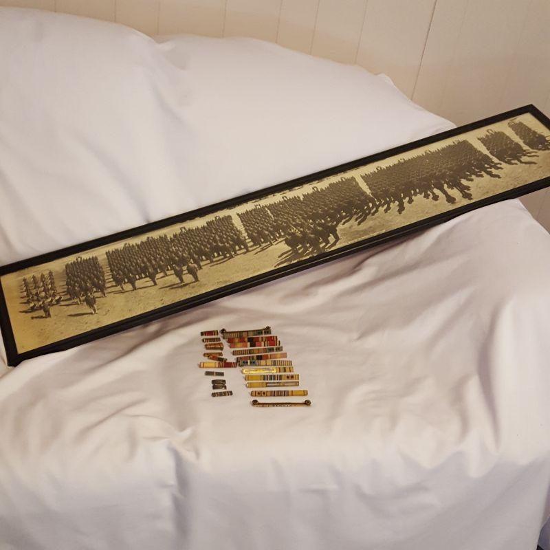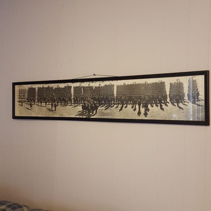 This vintage panoramic photograph of a 3rd Regiment would command a great conversation piece in any room of your home. The photo measures 10x52.5 inches and is framed in black wood. This lot also includes military ribbons. The ribbons of course have some wear and tear on them, but still look good. The ribbons measure approximately 4.5 inches long. Shipping available. Please call UPS for shipping quote for photograph may be expensive.