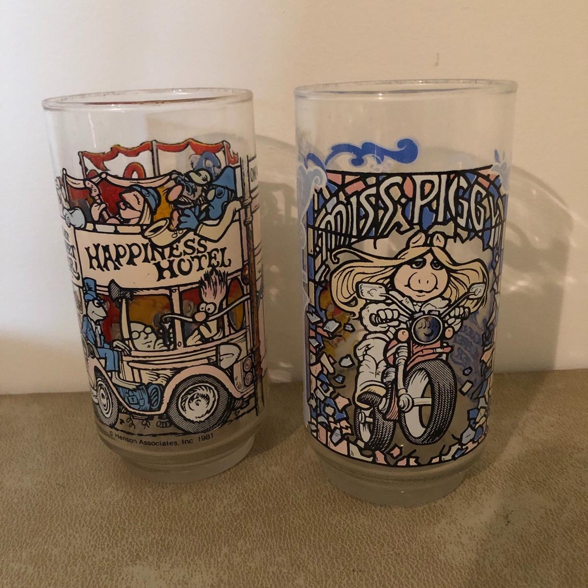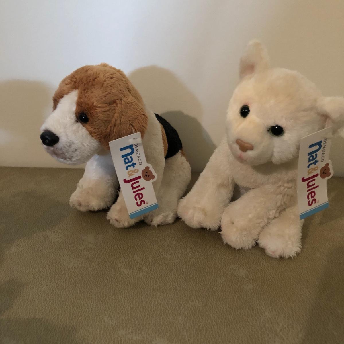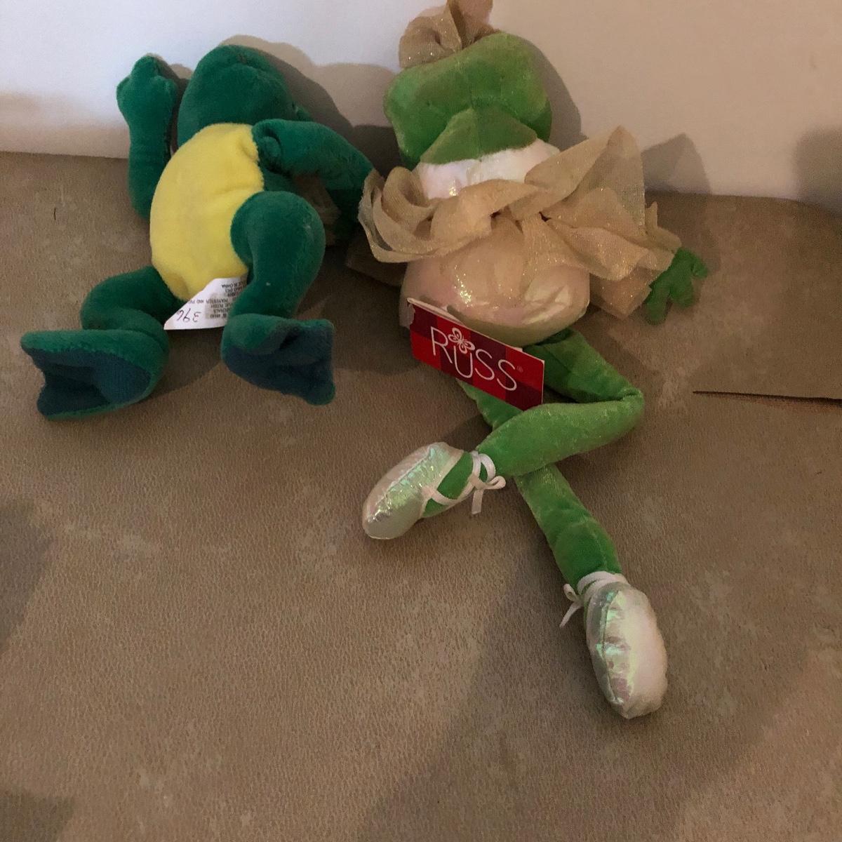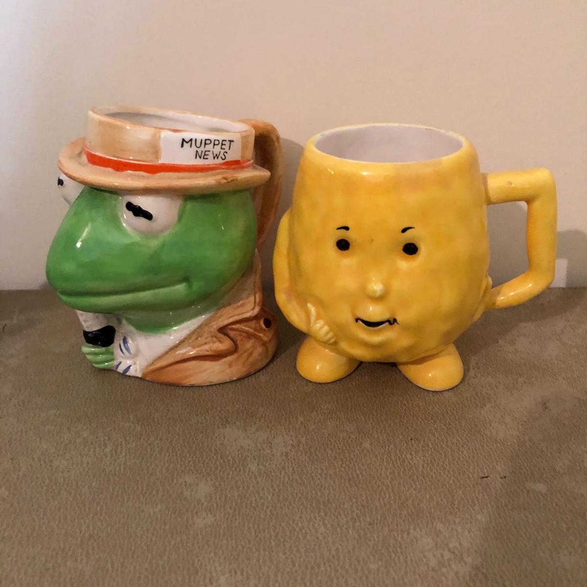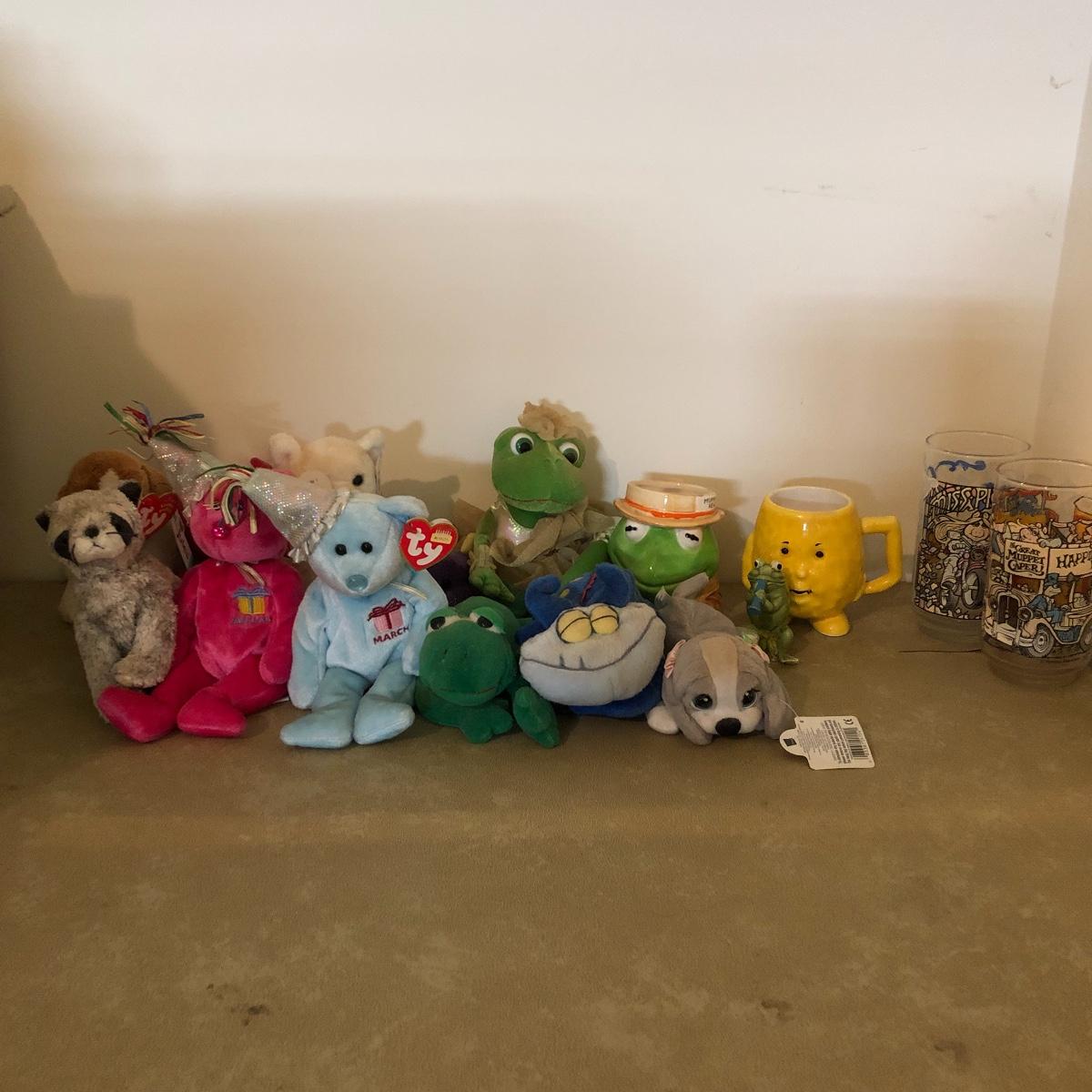 Lot includes Kermit coffee cup, two Miss Piggy glasses, three Ty animals, two Nat and Jules stuffed dogs, two frogs and more stuffed animals. 3” x 5” x 12”.