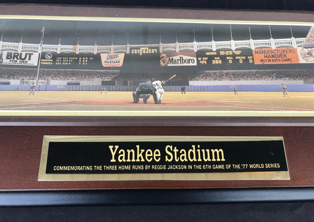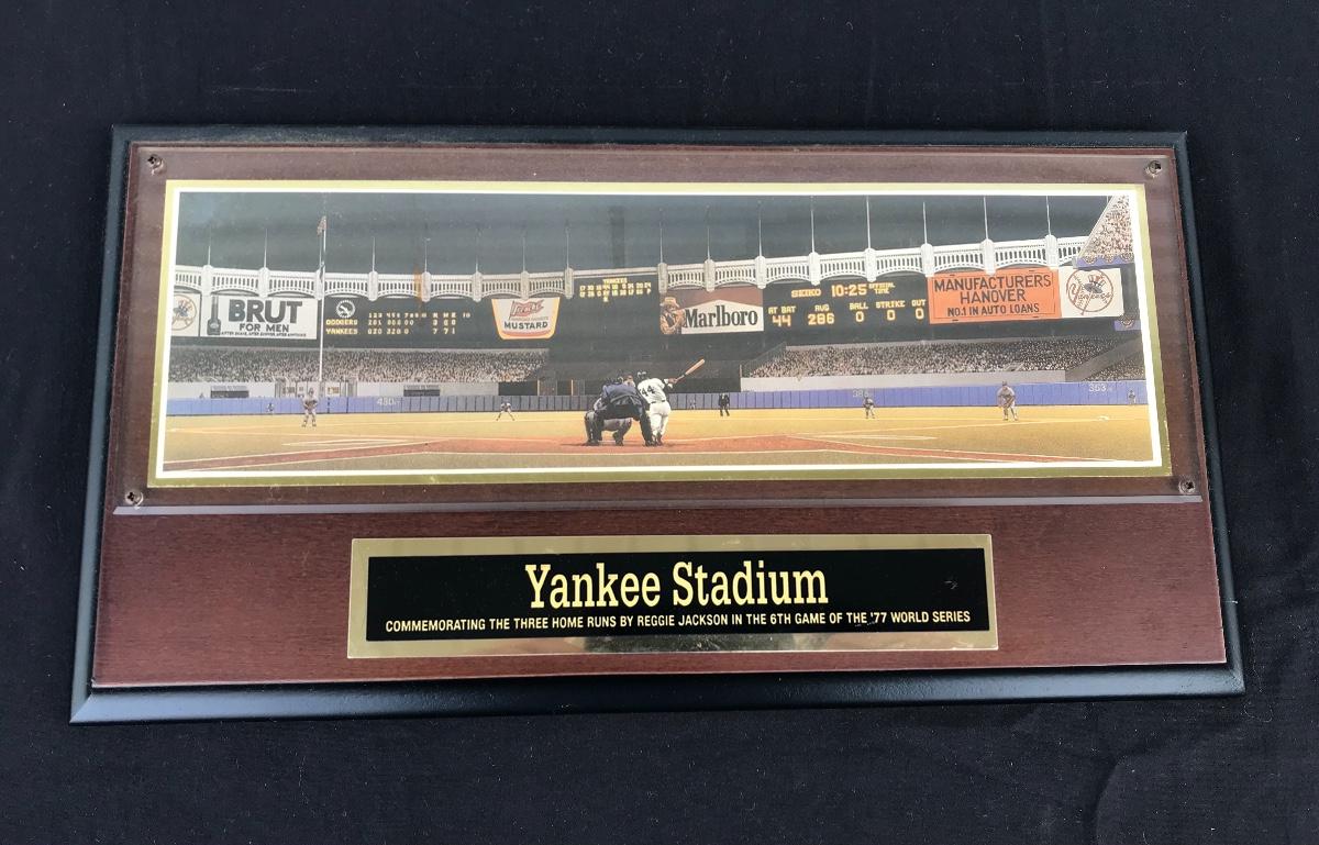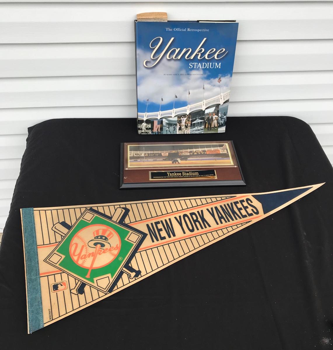 New York Yankees Memorabilia Book, Plaque, Pennant - book is history of Yankee Stadium entitled Yankee Stadium: The Official Retrospective and the plaque commemorates Reggie Jackson's three home run game in the 1977 World Series. The pictures show condition, measurements if taken, and what is included in the lot. Due to the large amount that we photograph and the time frame, we are not always able to take measurements. All items unless noted, are pre-owned and have been used. If you purchased furniture, you must bring help. We do not allow one person to carry large furniture out on their own. Bring help, tools and a truck for the safety of our client’s homes, and your personal safety. Company policy. Thank you.