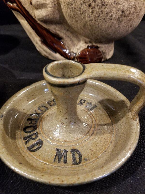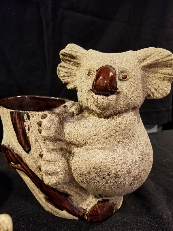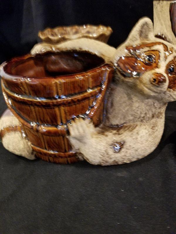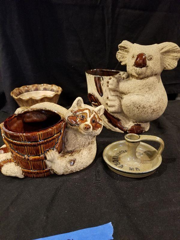 Royal Haeger Racoon Planter (marked), Koala Planter, Brown Drip Planter and Candlestick Signed by Artist