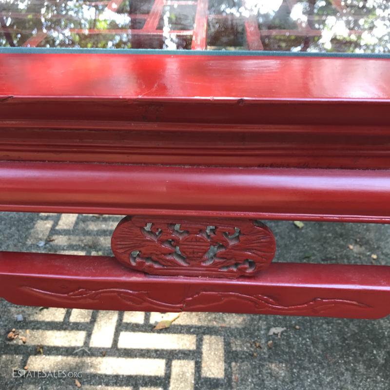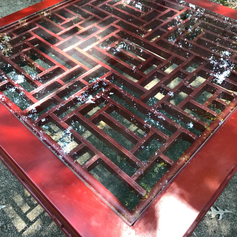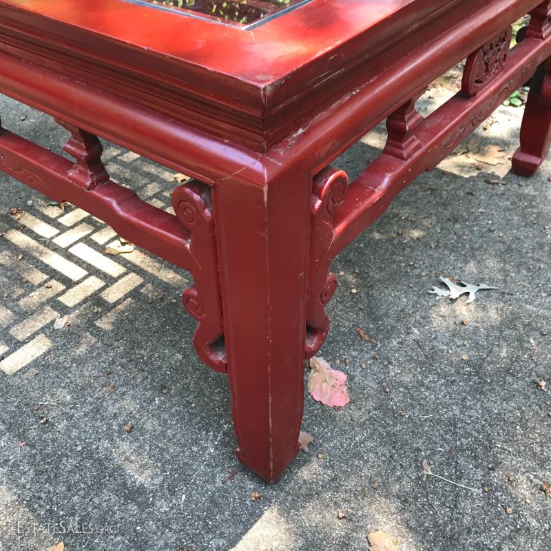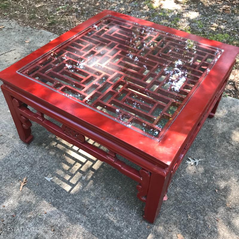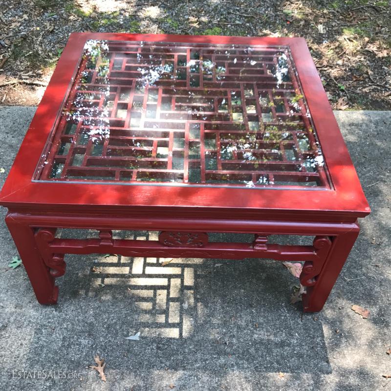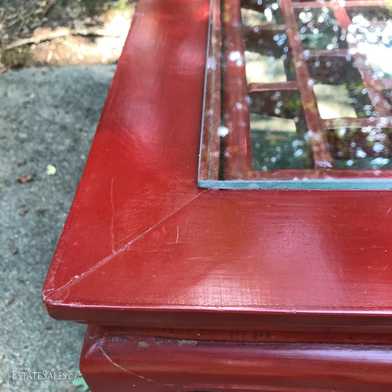 Square wood and glass top coffee table. Red color. Cool design under glass. Please note the glass does not fit perfectly into slot for table. See photo. Also there is marker writing on the glass that appears to come off with some scrubbing.