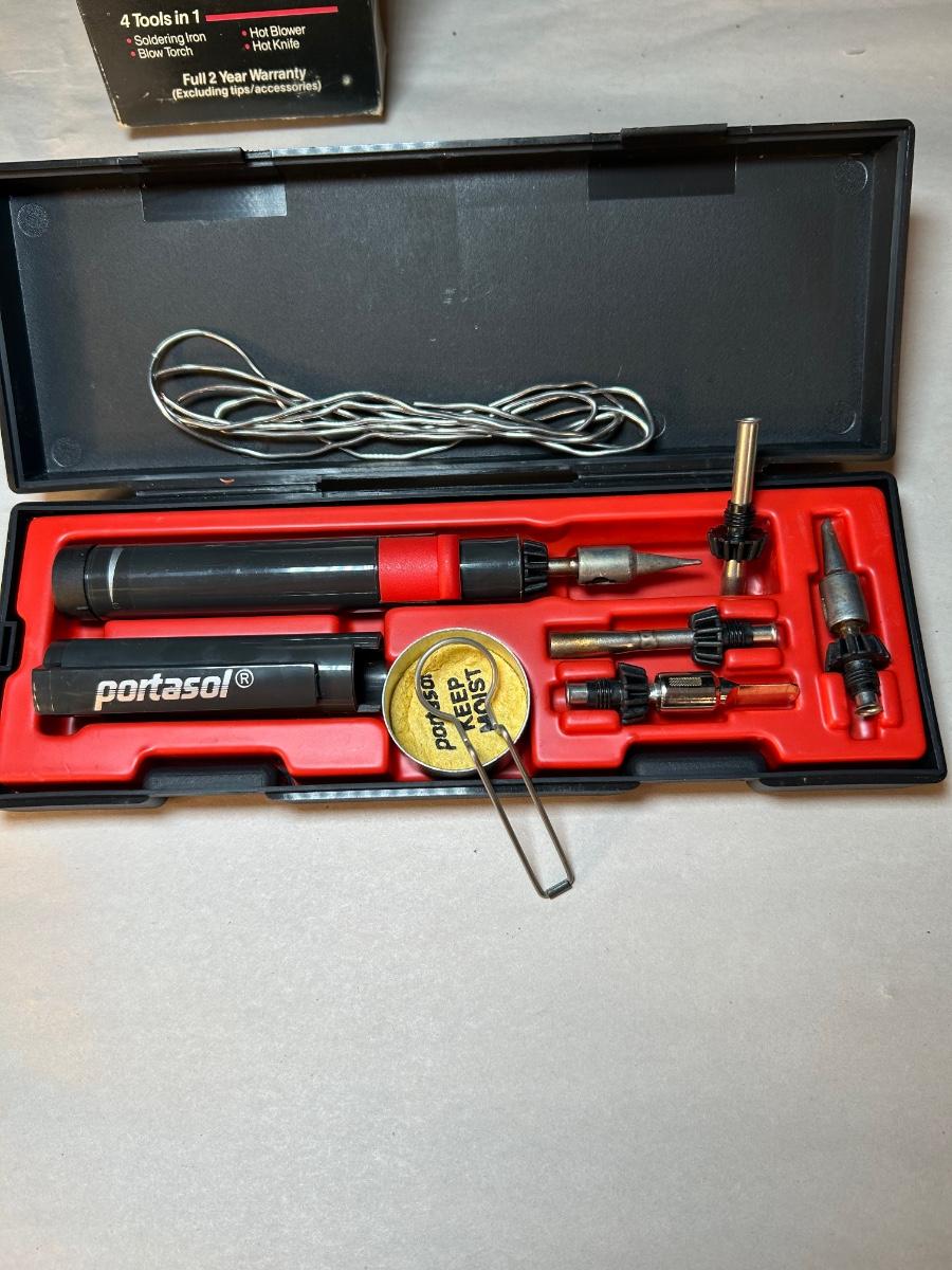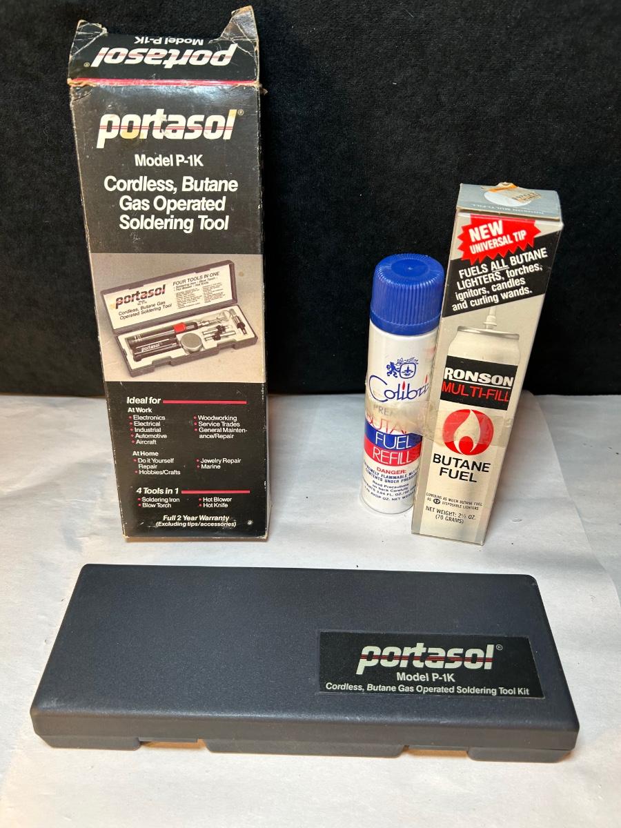Portasol cordless, butane-operated soldering tool kit and two cans of butane