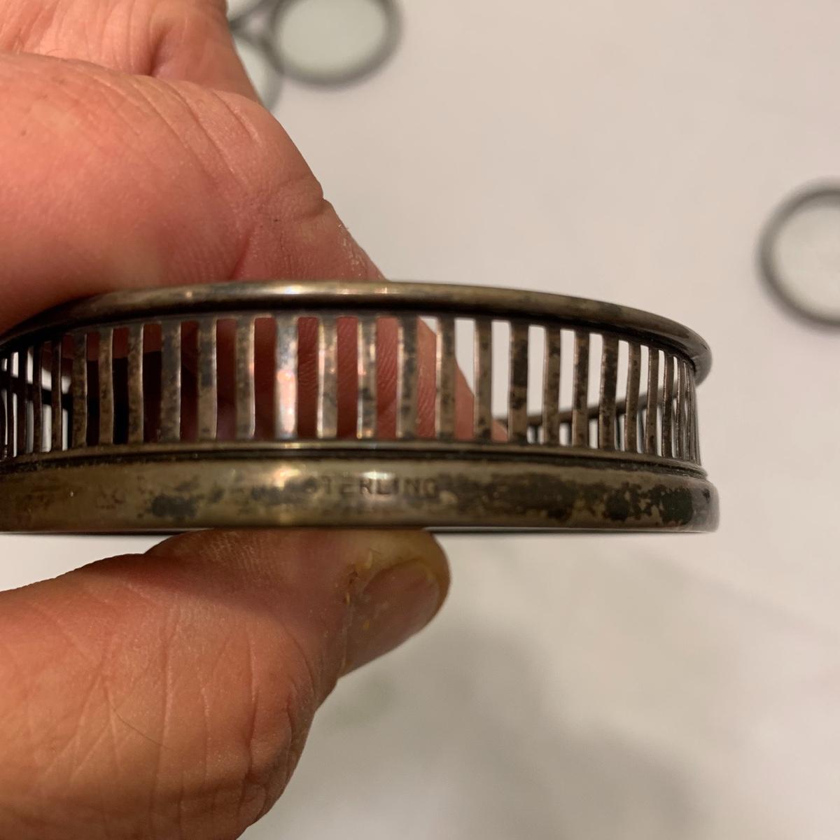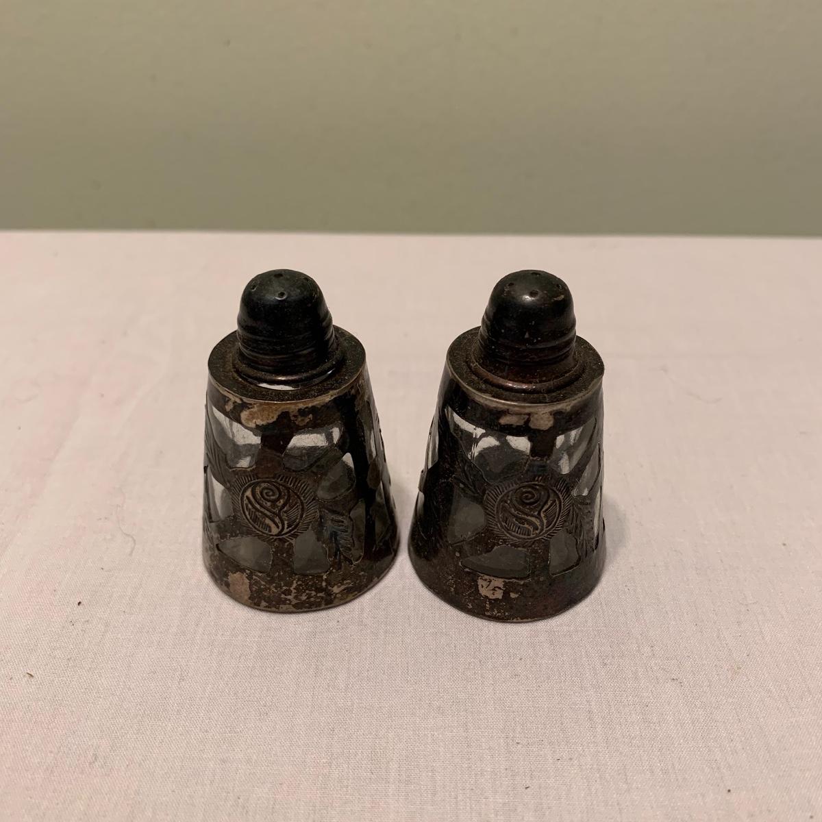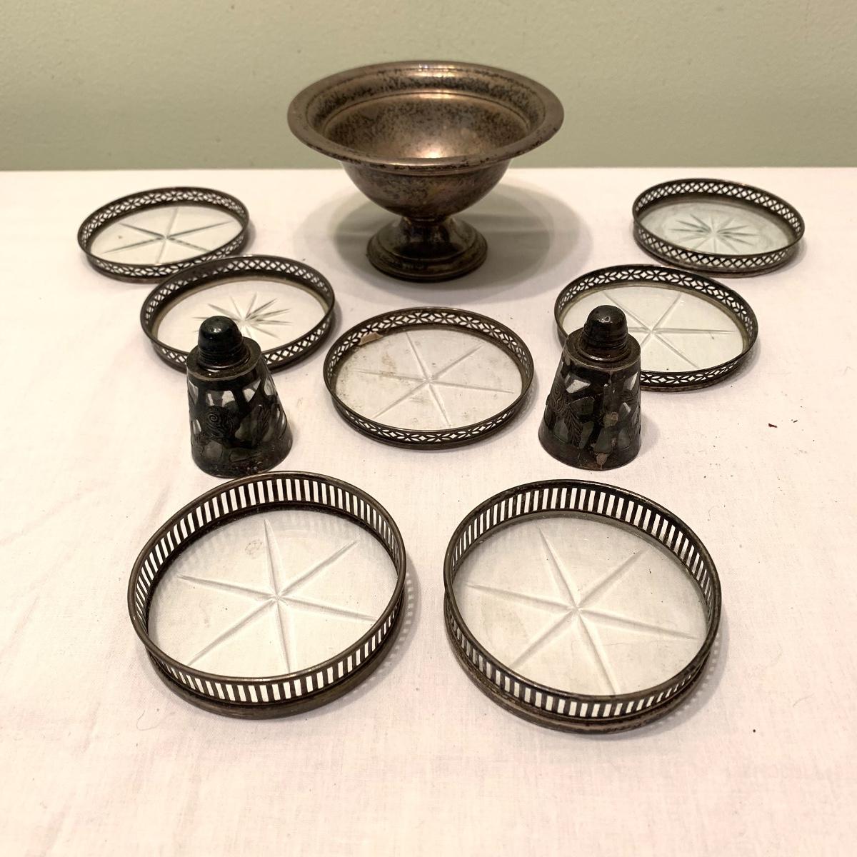 Don’t pass up this lot of vintage sterling silver accessories. This lot includes a small footed and decorative bowl, seven Silver rimmed glass coasters, and a cute pair of Sterling overlaid glass salt & pepper shakers. See pics for details. No found markings on the coasters. Shipping available.
