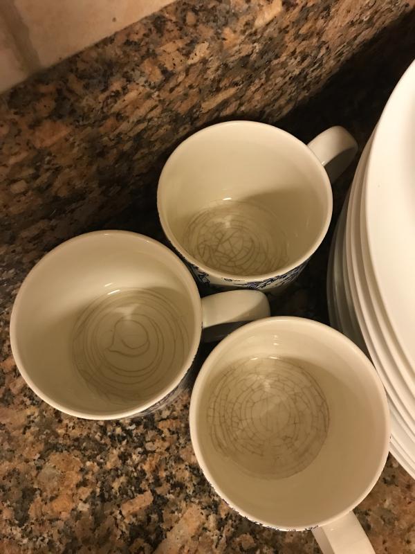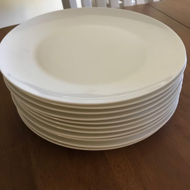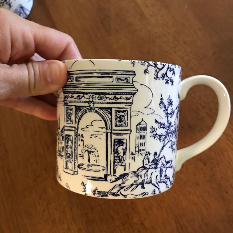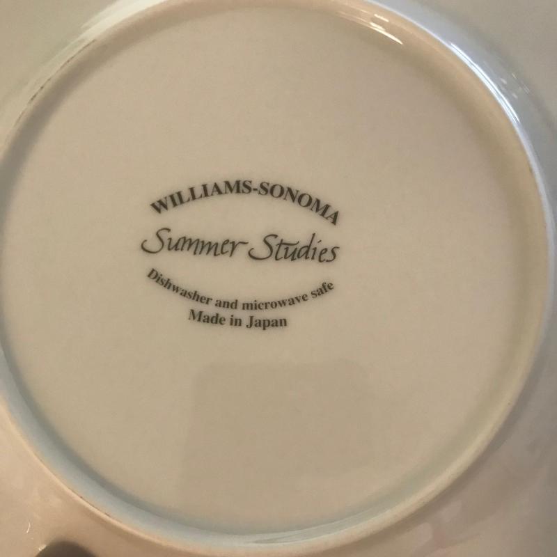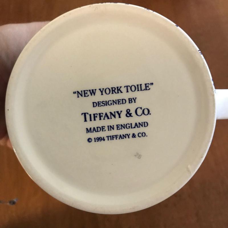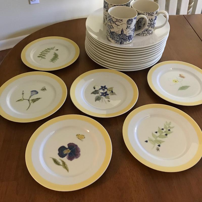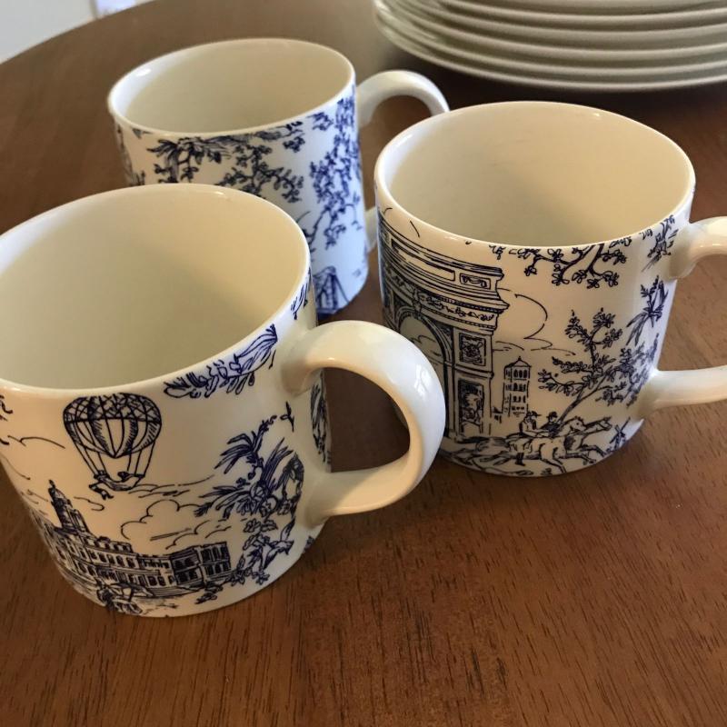 Three Tiffany & Co. Mugs “New York Toile” All three have crackling inside. Lot also includes set of six Williams-Sonoma “Summer Studies” plates in excellent condition. 11 Large White Dinner plates by Elite will round out this collection. No shipping.
