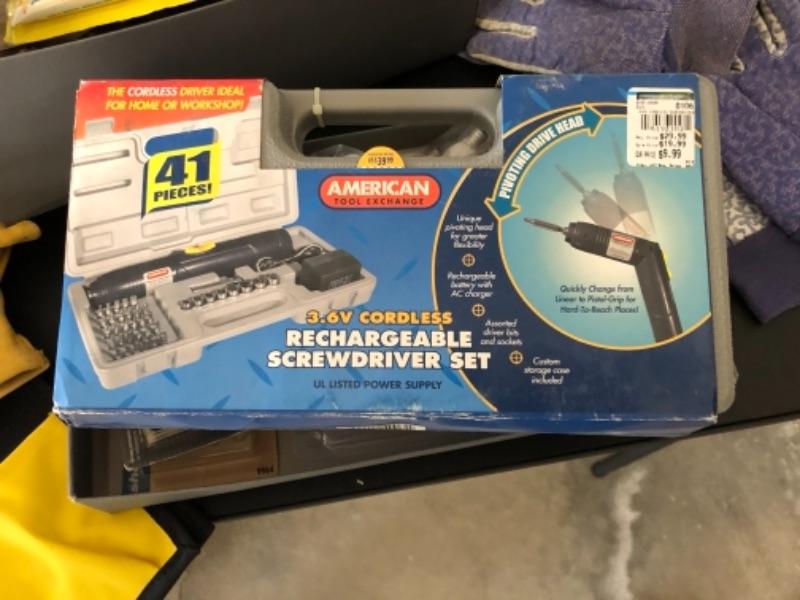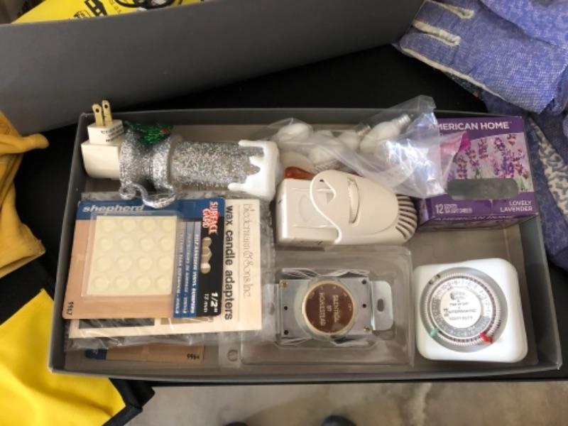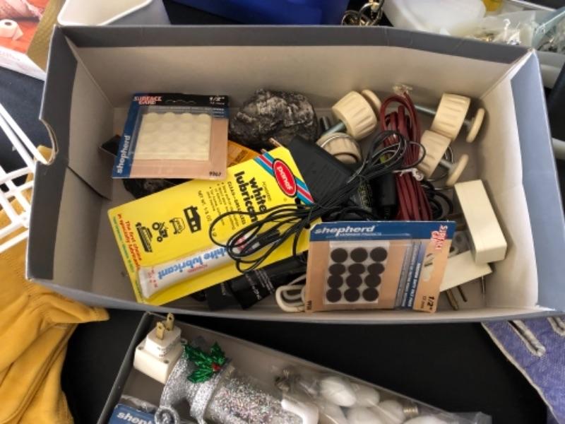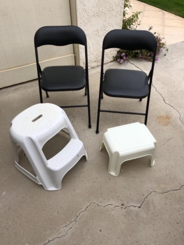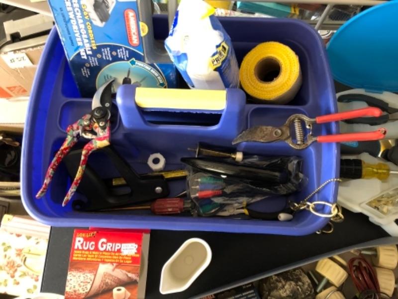 Lot 81. Tool kits, gloves, gardening tools, foam blocks, screw driver set, tool bucket and pouch hardware, two folding chairs and two plastic stools, etc.--WAS $85““NOW $42.50
