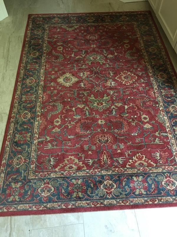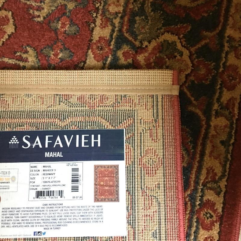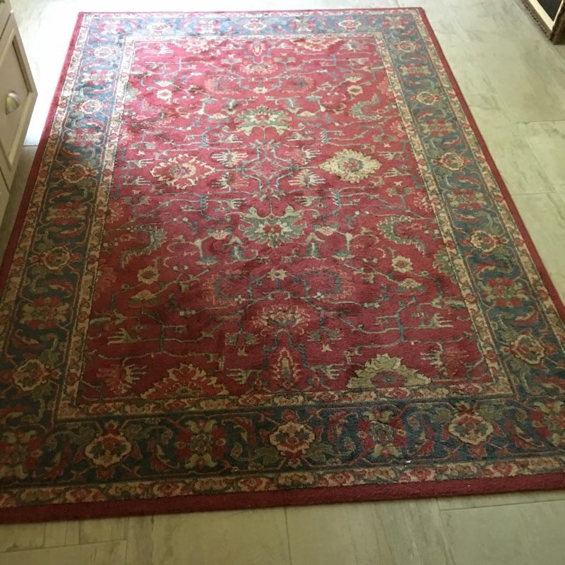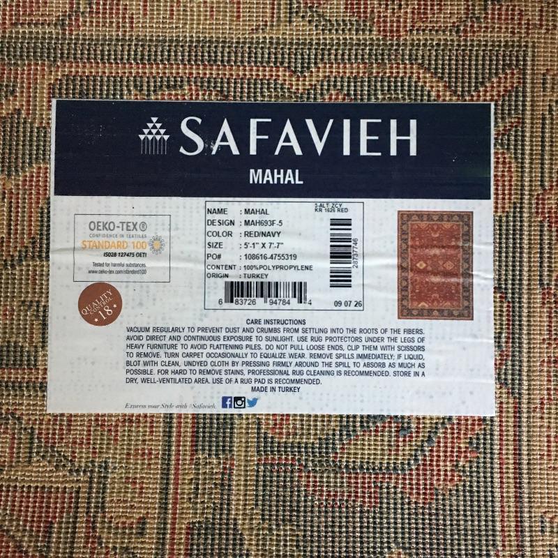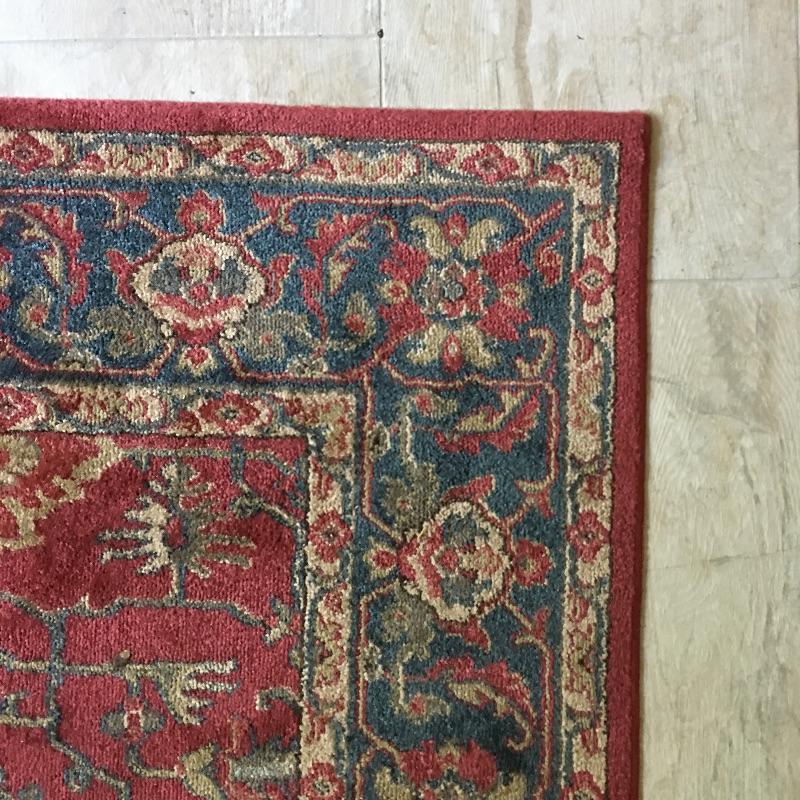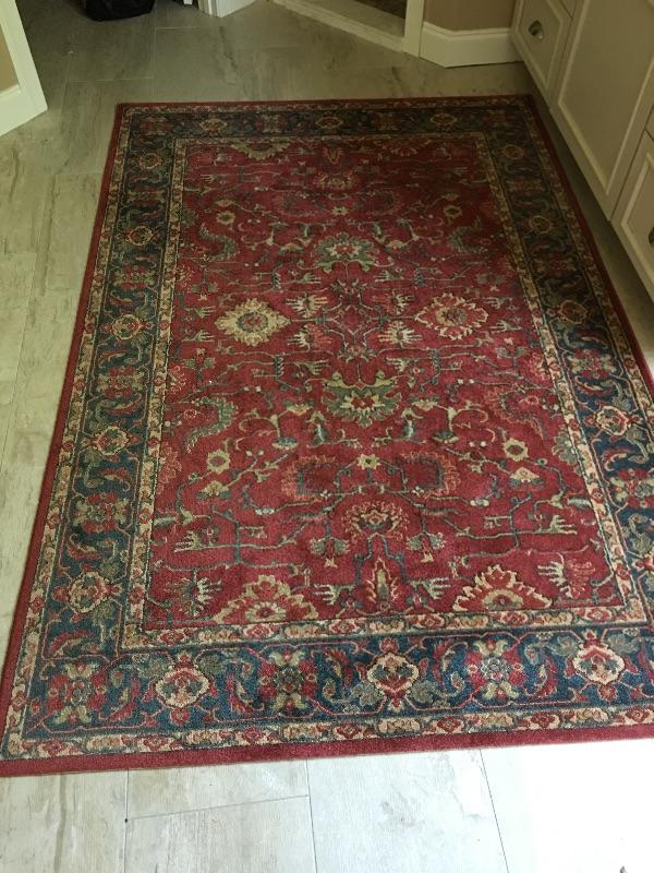 Gorgeous Turkish rug in red and navy that measures 61” x 91.5”(appox 5'x8'). Beautify your room and protect your floors with this colorful area rug. See photo of tag for details.