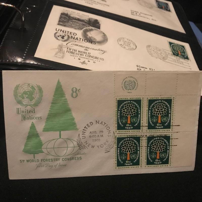Two matching blue United Nations First Day Cover booklets full of various countries, dates, and cachets. A plethora of four stamps per envelope and many with just one. All appear to be cancelled first day issues.