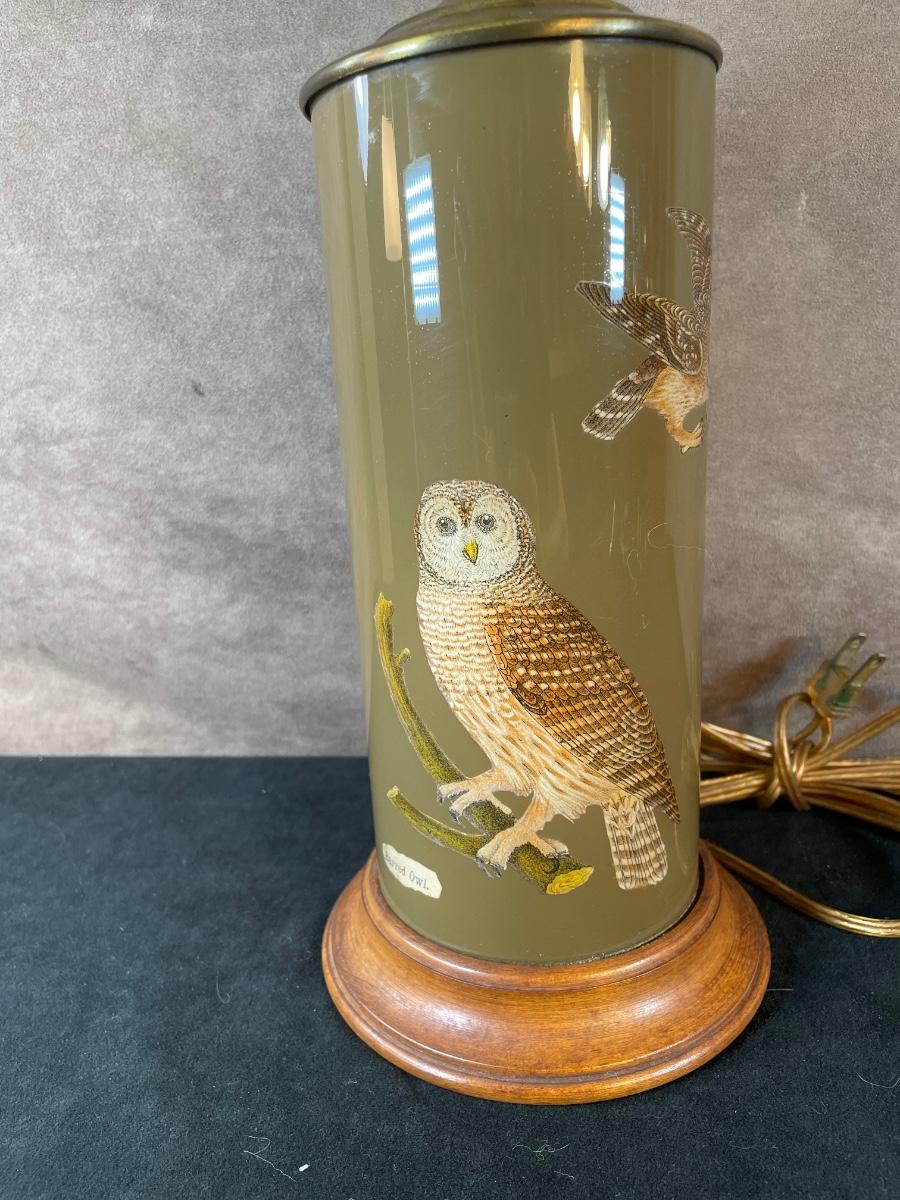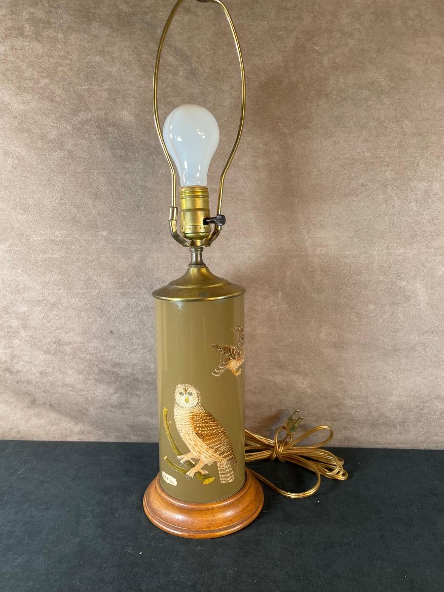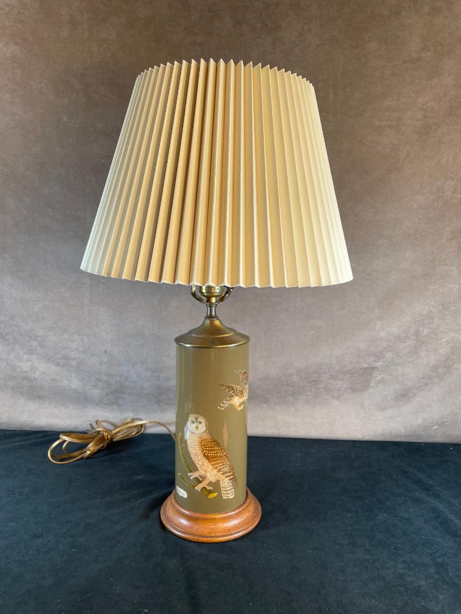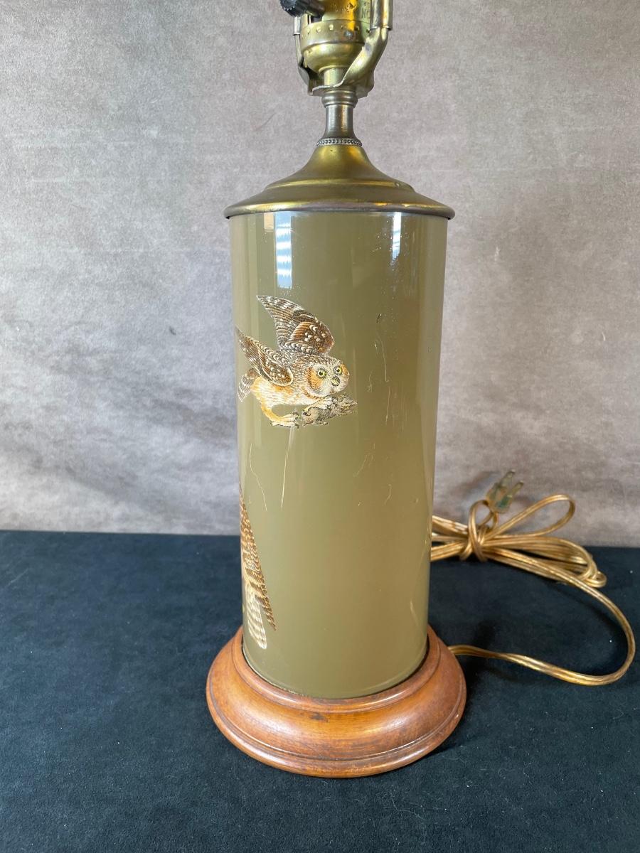 22: tall. glass column with owl design printed on the back side of the glass. Wood base