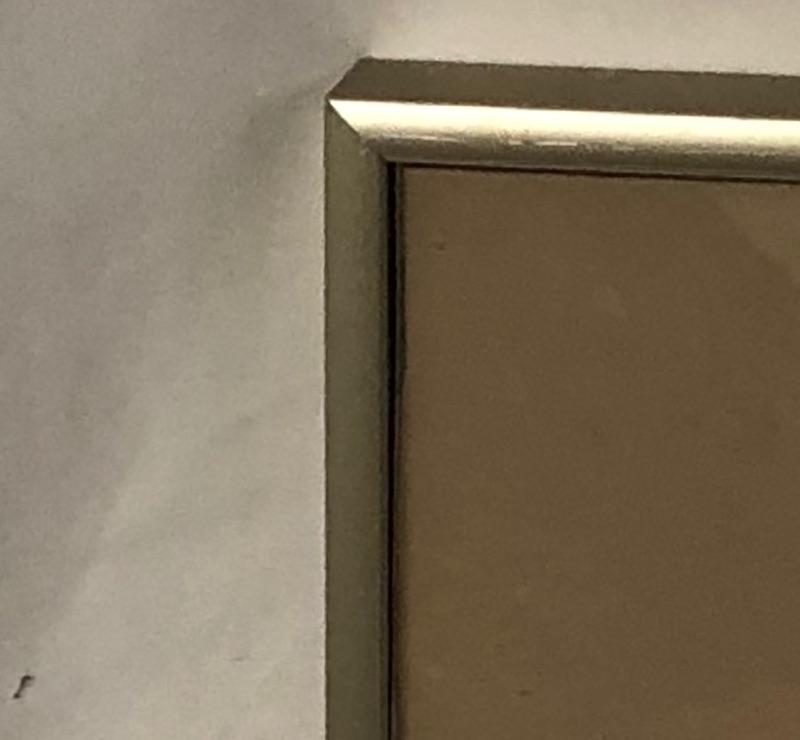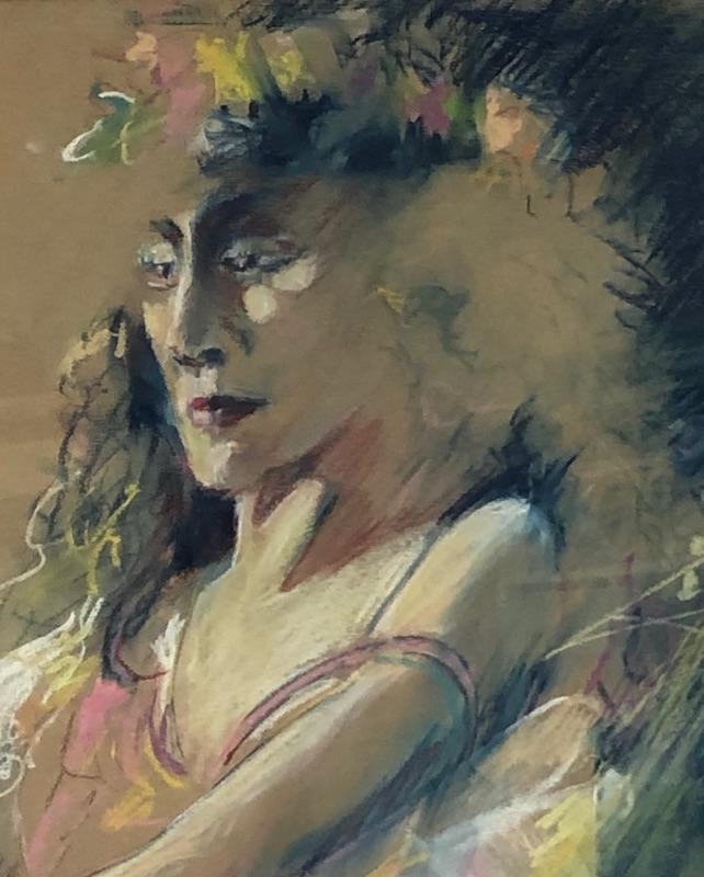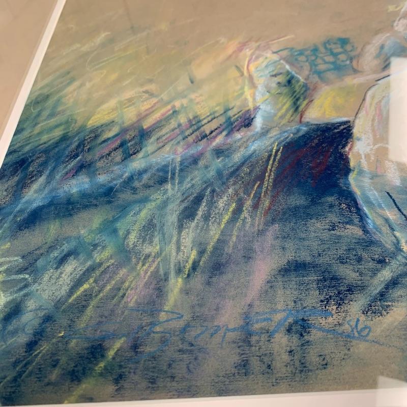 This lovely framed pastel of a woman sitting deep in thought, is mounted in a metal frame; no hanging hardware on the frame. Signed by the Artist. Frame measures 22” x 32”. Unique matting is off center in frame.