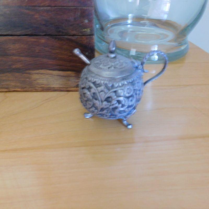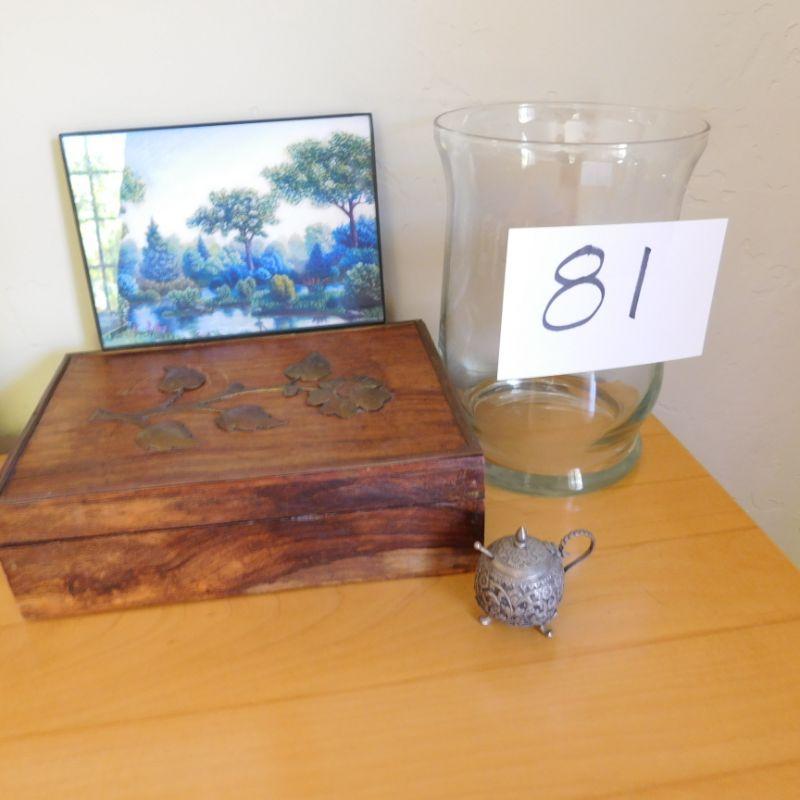 Lot 81 wood decorative box small metal pot small piece of art and a clear vase