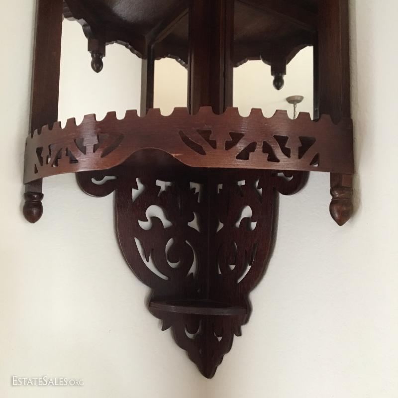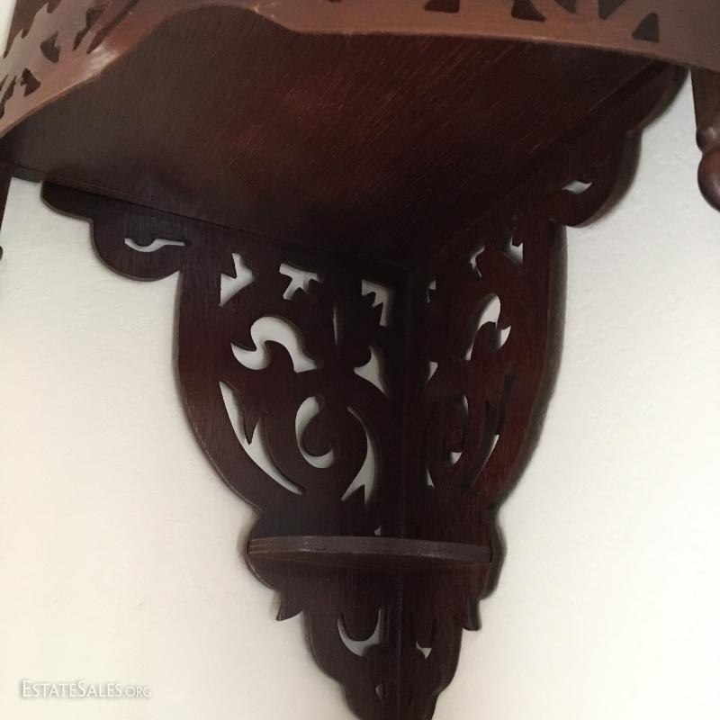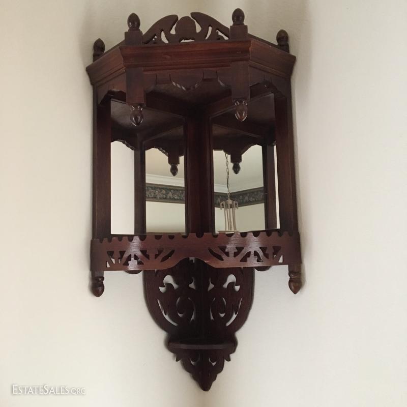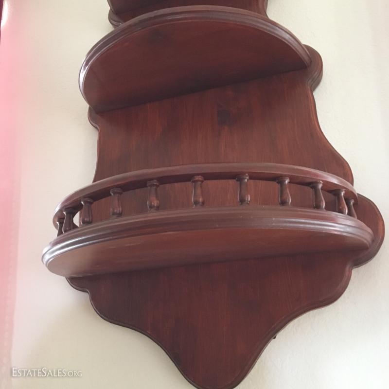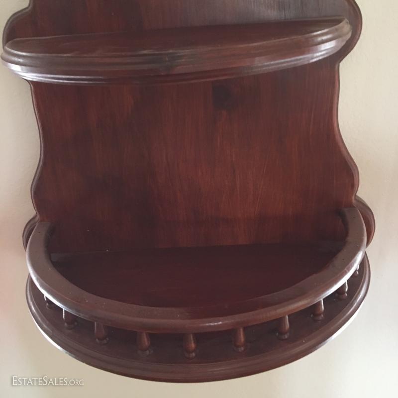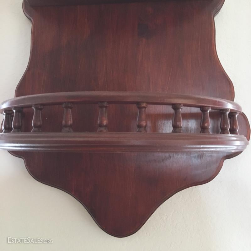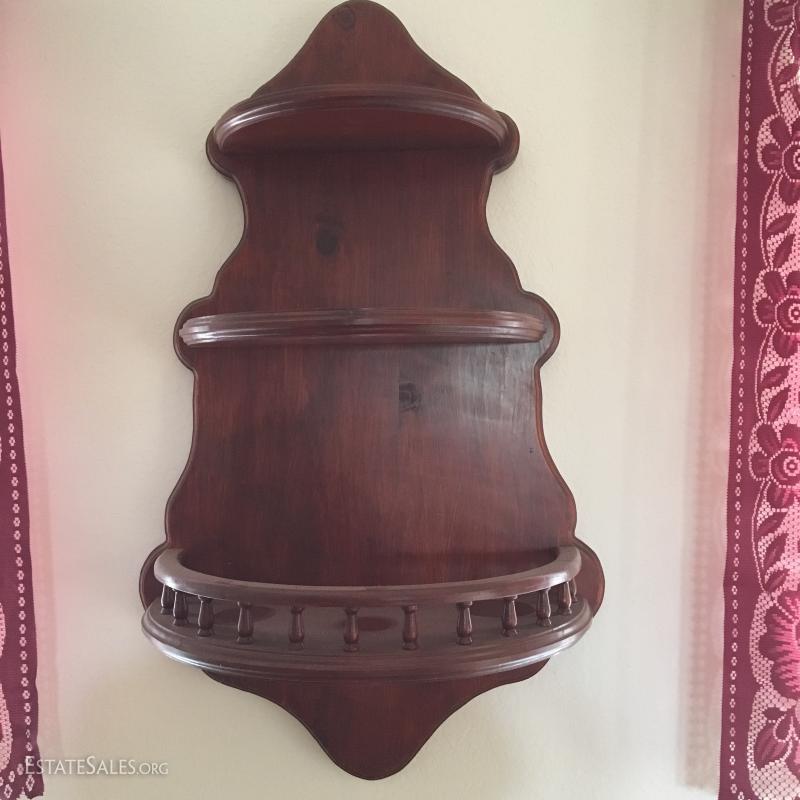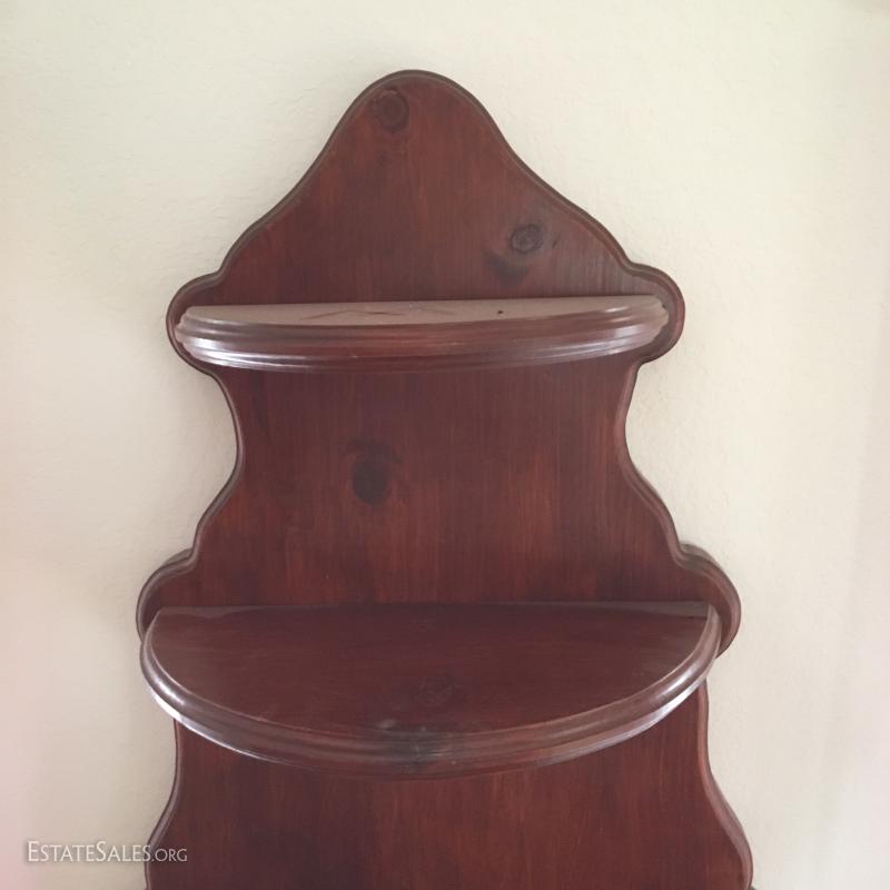One Carved Wood Corner Shelf with Mirror and One Wood Hanging Shelving with Three Tier Shelves. Corner shelf measures: 26.5" and 3 tier shelf measured 32.5"x20.5"