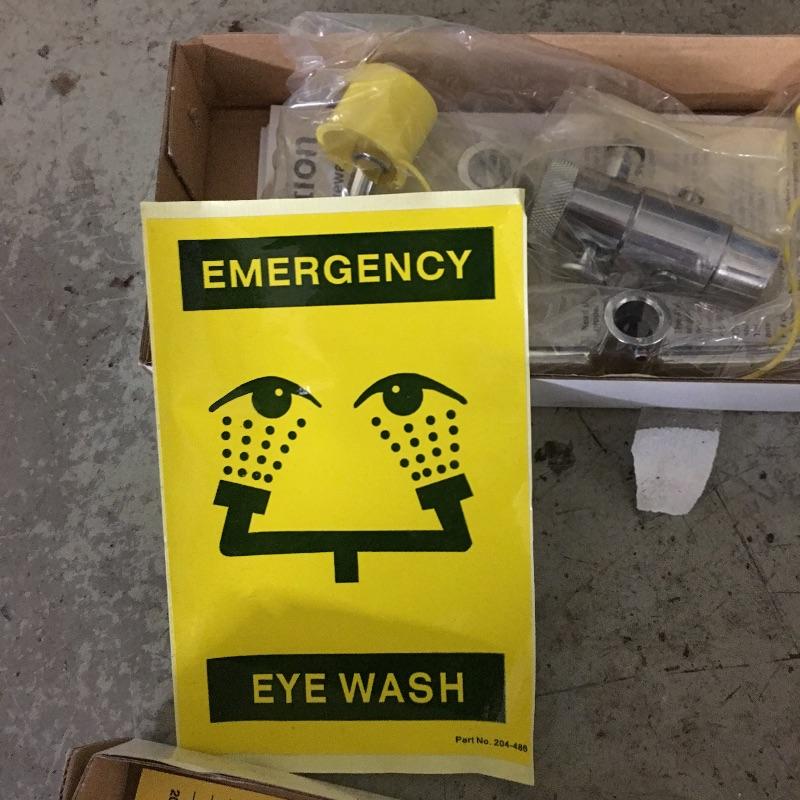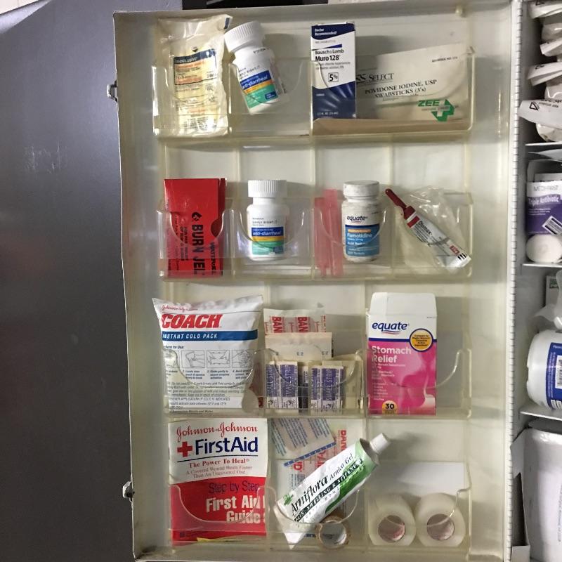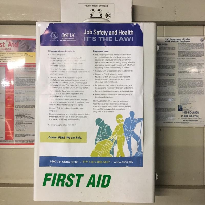Zee first aid cabinet with contents and faucet mount emergency eye wash. Be ready for emergencies with this large Zee first aid cabinet and eye wash. Cabinet measures 6.75” x 15” x 22.25”. Keep the workplace safe with Labor Laws, First Aid, MSDS and OSHA posters. Dates on posters appear to be 2009/2011. See photos.
